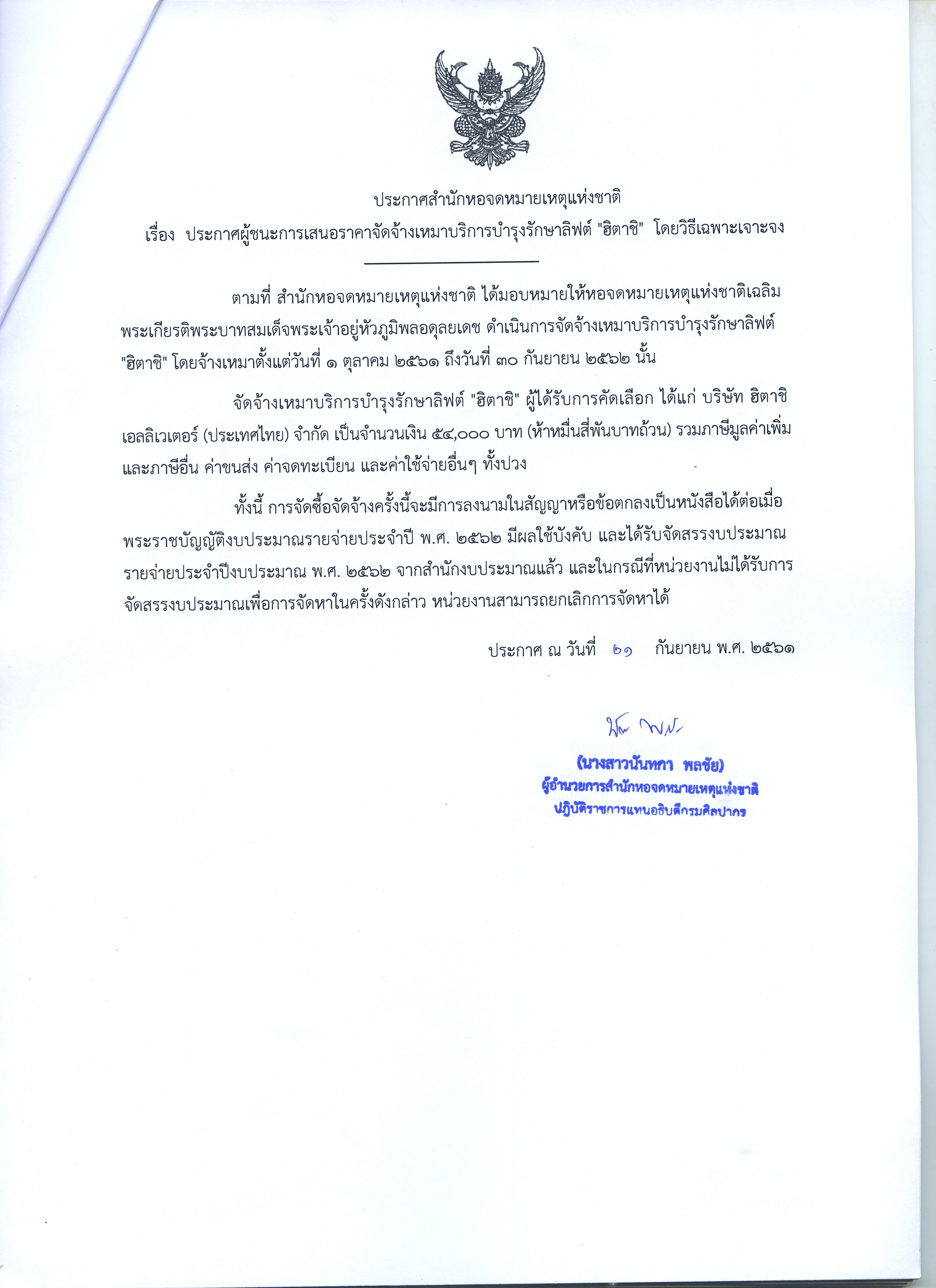 ประกาศผู้ชนะการเสนอราคาจัดจ้างเหมาบริการบำรุงรักษาลิฟท์ "ฮิตาชิ" โดยวิธีเฉพาะเจาะจง