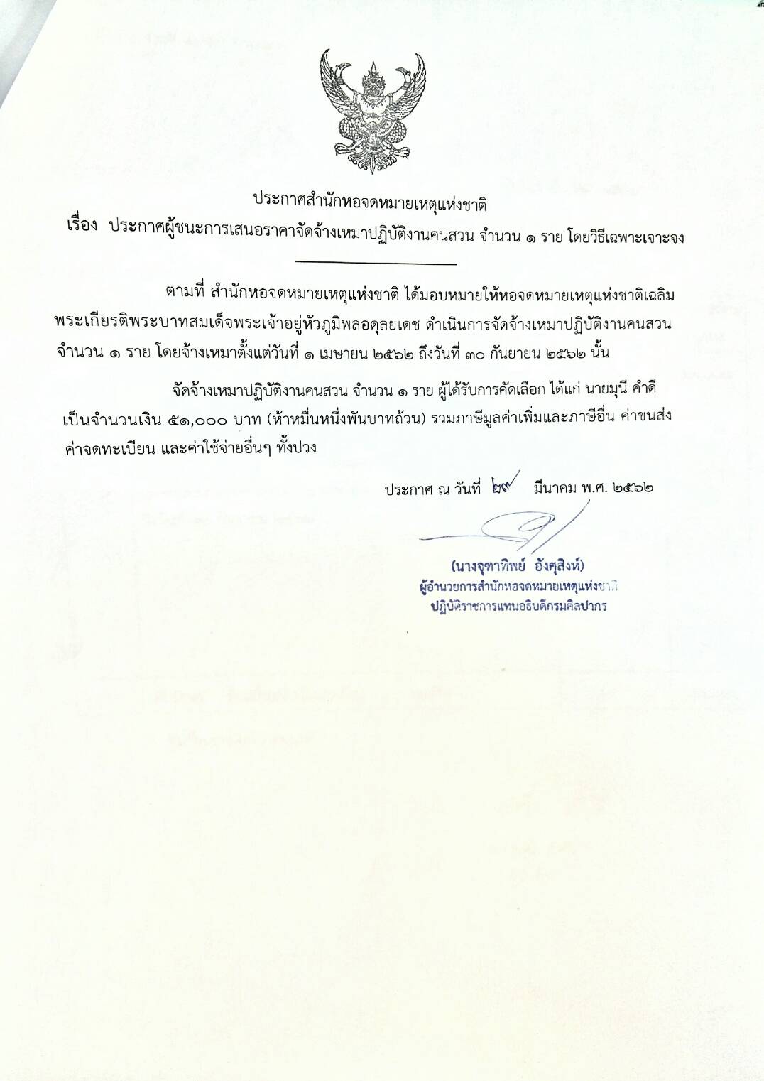 ประกาศผู้ชนะการเสนอราคาจัดจ้างเหมาปฏิบัติงานคนสวน