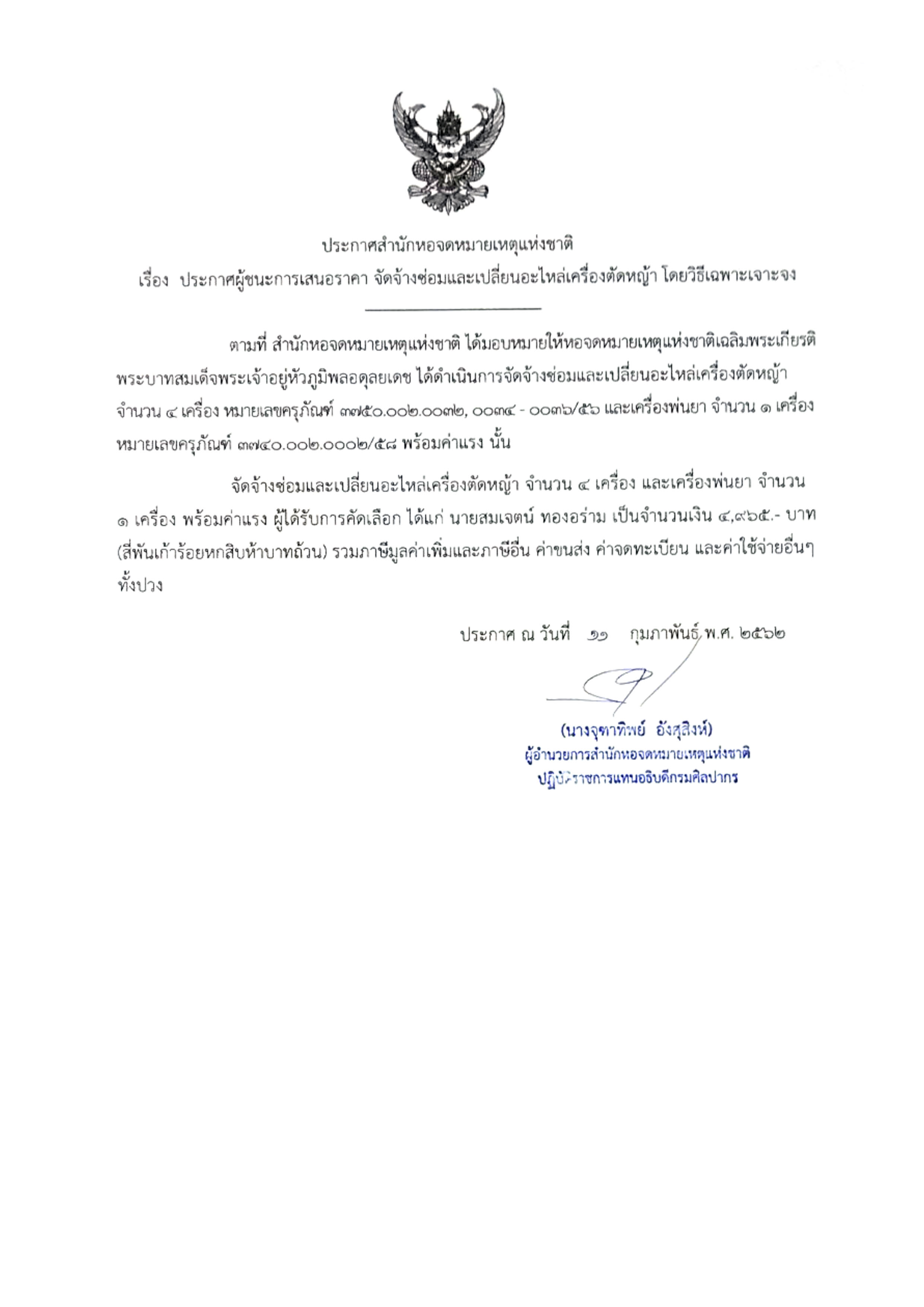 ประกาศผู้ชนะการเสนอราคา จัดจ้างซ่อมและเปลี่ยนอะไหล่เครื่องตัดหญ้า