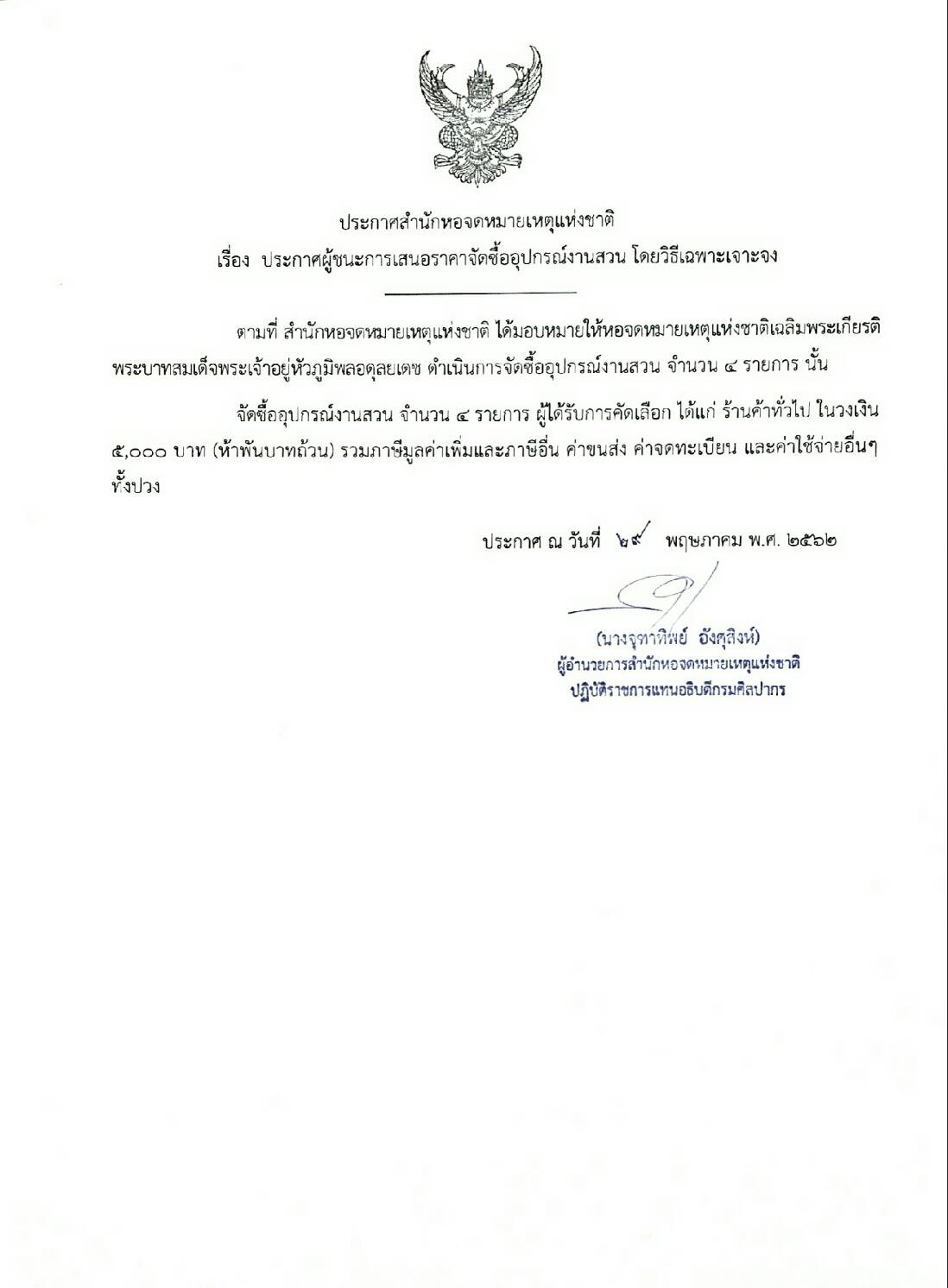 ประกาศผู้ชนะการเสนอราคาจัดซื้ออุปกรณ์งานสวน โดยวิธีเฉพาะเจาะจง