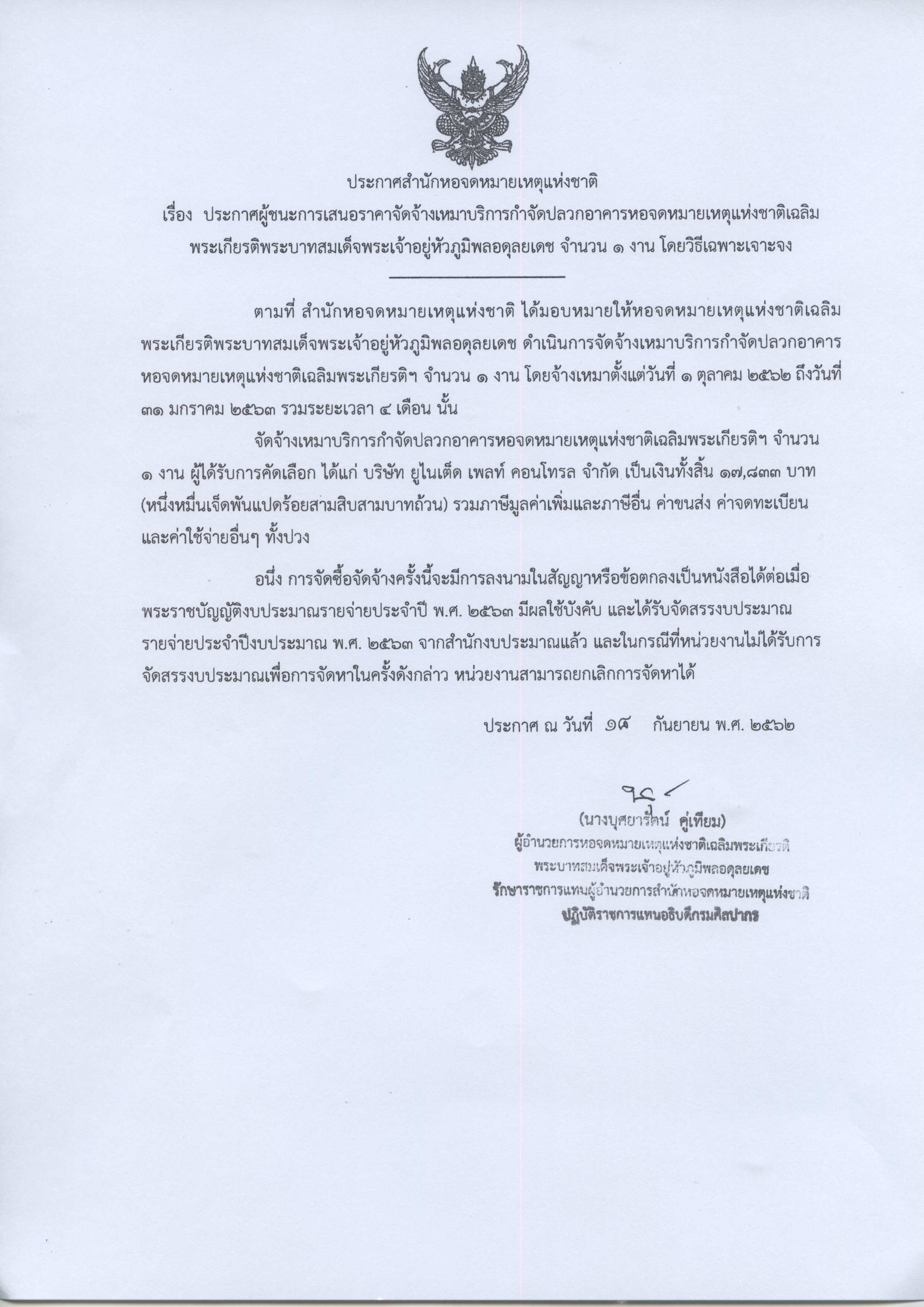 ประกาศผู้ชนะการเสนอราคาจัดจ้างเหมาบริการกำจัดปลวกอาคารหอจดหมายเหตุแห่งชาติ เฉลิมพระเกียรติพระบาทสมเด็จพระเจ้าอยู่หัวภูมิพลอดุลยเดช