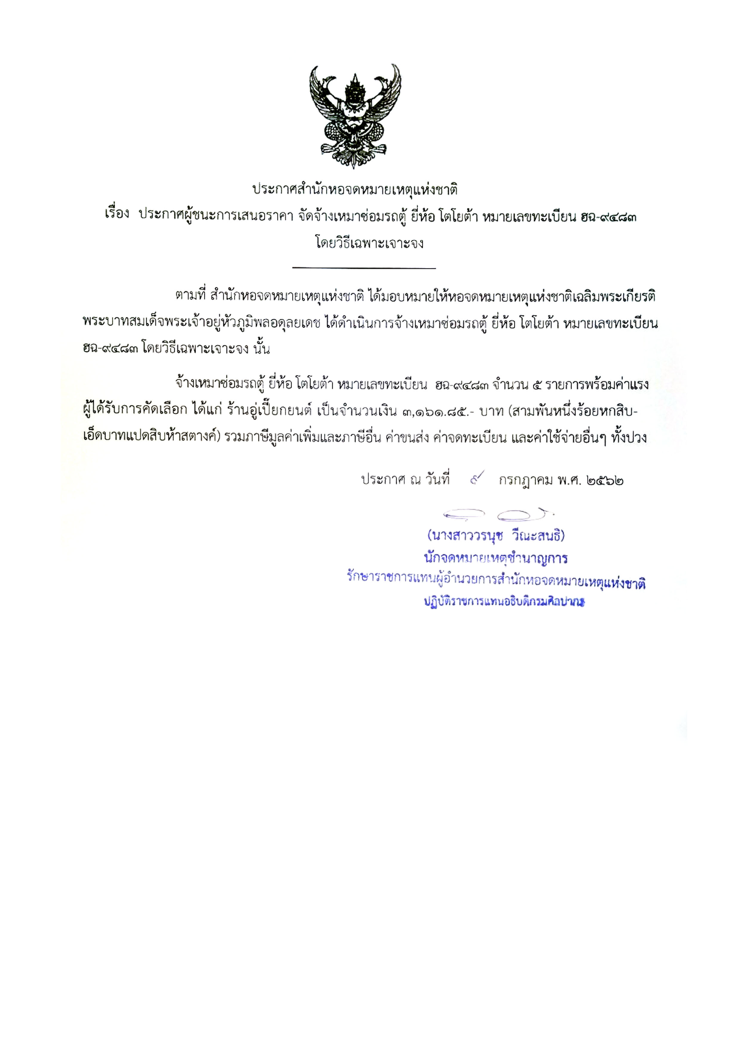 ประกาศผู้ชนะการเสนอราคา จัดจ้างเหมาซ่อมรถตู้