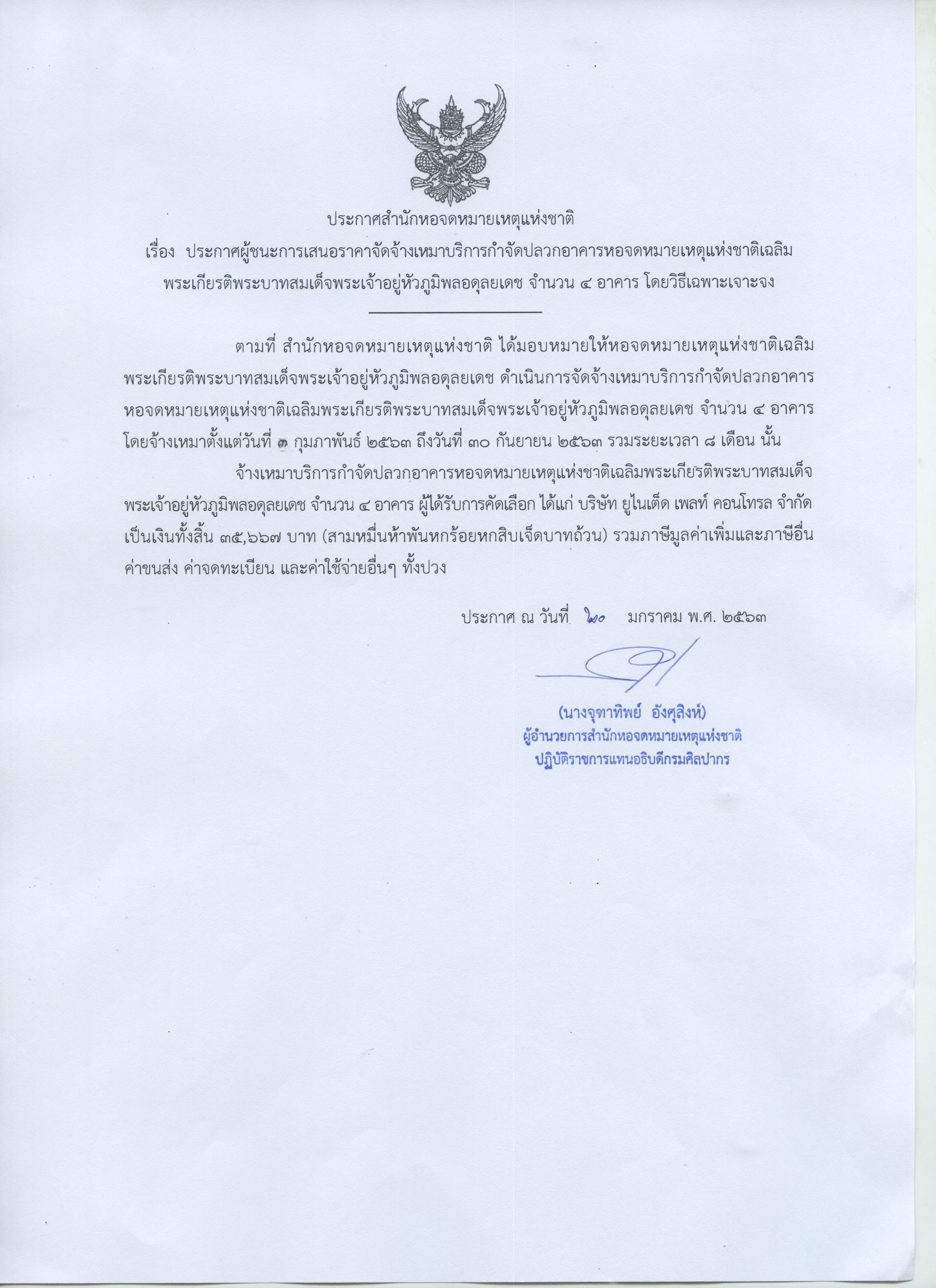ประกาศผู้ชนะการเสนอราคาจัดจ้างเหมาบริการกำจัดปลวกอาคารหอจดหมายเหตุแห่งชาติเฉลิมพระเกียรติพระบาทสมเด็จพระเจ้าอยู่หัวภูมิพลอดุลยเดช