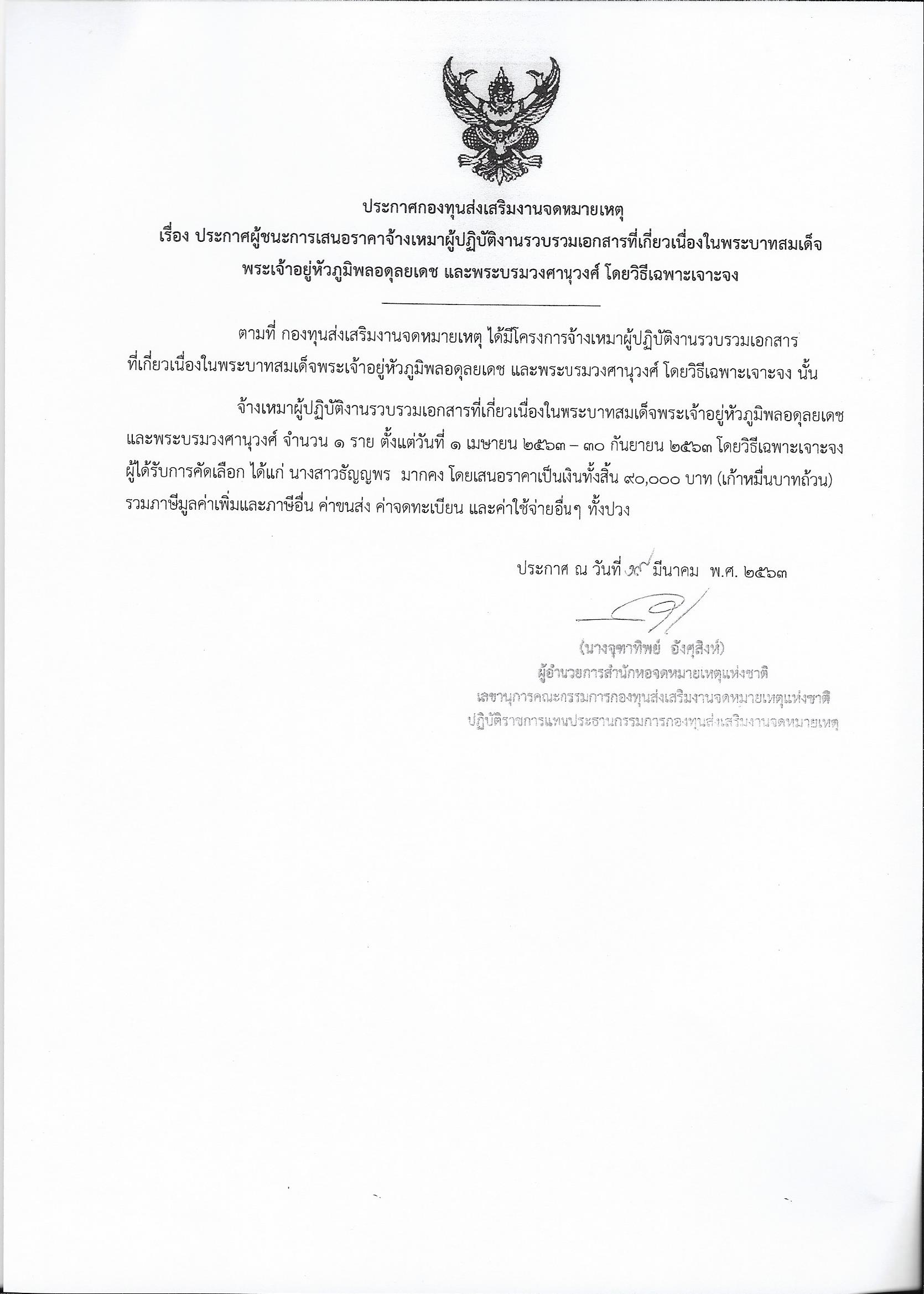 ประกาศผู้ชนะการเสนอราคาจ้างเหมาผู้ปฏิบัติงานรวบรวมเอกสารที่เกี่ยวเนื่องในพระบาทสมเด็จพระเจ้าอยู่หัวภูมิพลอดุลยเดช และพระบรมวงศานุวงศ์ โดยวิธีเฉพาะเจาะจง