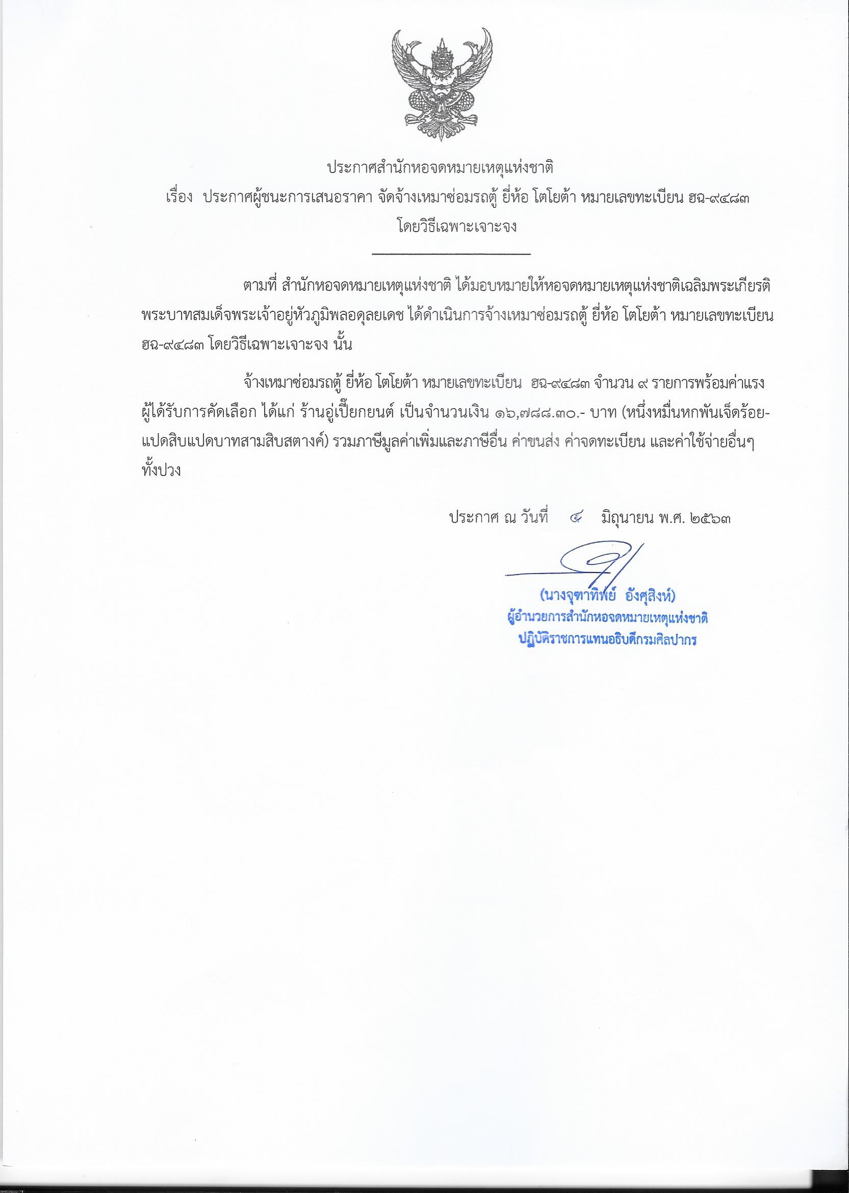 ประกาศผู้ชนะการเสนอราคา จัดจ้างเหมาซ่อมรถตู้ ยี่ห้อ โตโยต้า หมายเลขทะเบียน ฮฉ-๙๔๘๓ โดยวิธีเฉพาะเจาะจง
