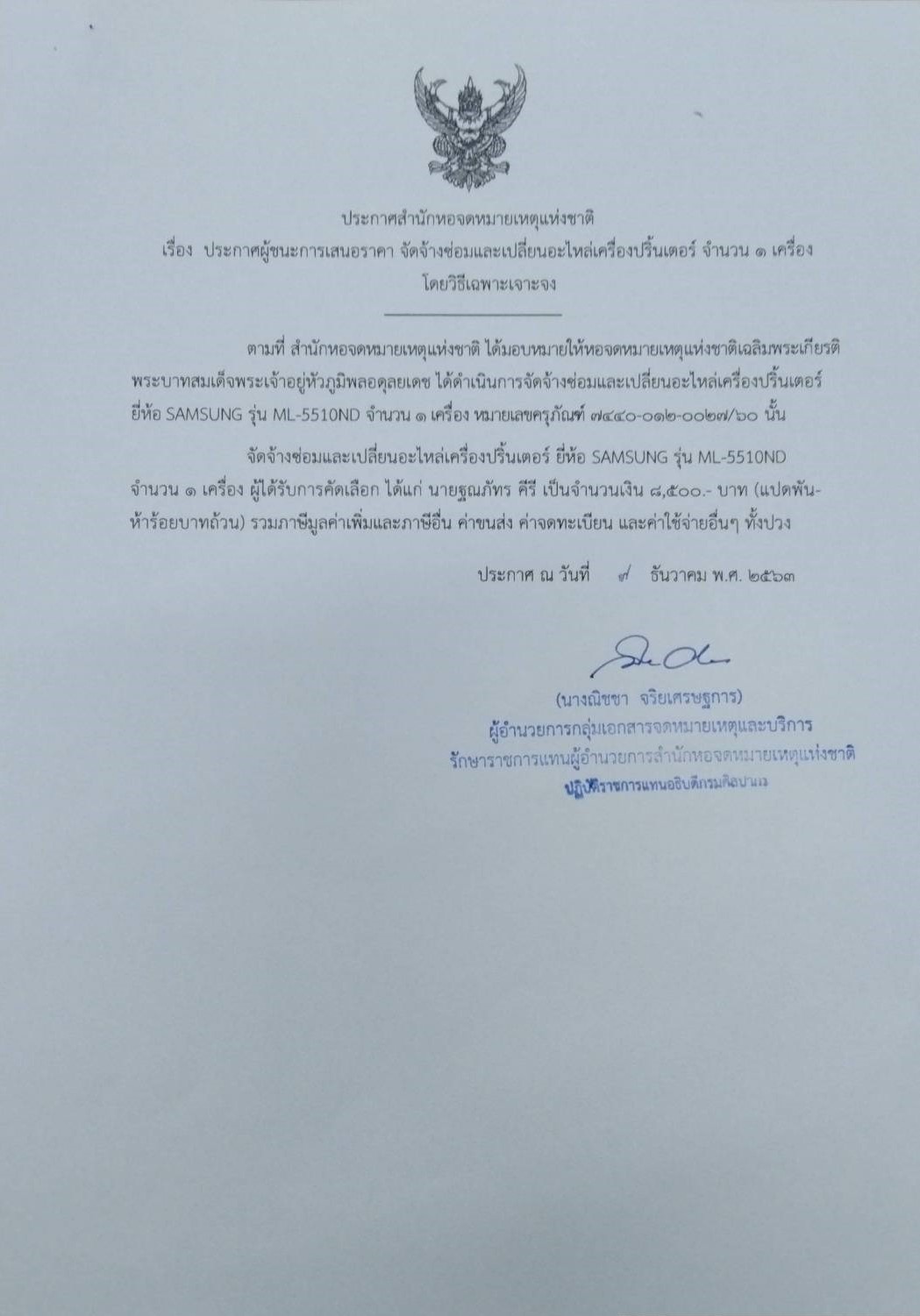 ประกาศสำนักหอจดหมายเหตุแห่งชาติ เรื่อง ประกาศผู้ชนะการเสนอราคา จัดจ้างซ่อมและเปลี่ยนอะไหล่เครื่องปริ้นเตอร์ จำนวน ๑ เครื่อง โดยวิธีเฉพาะเจาะจง