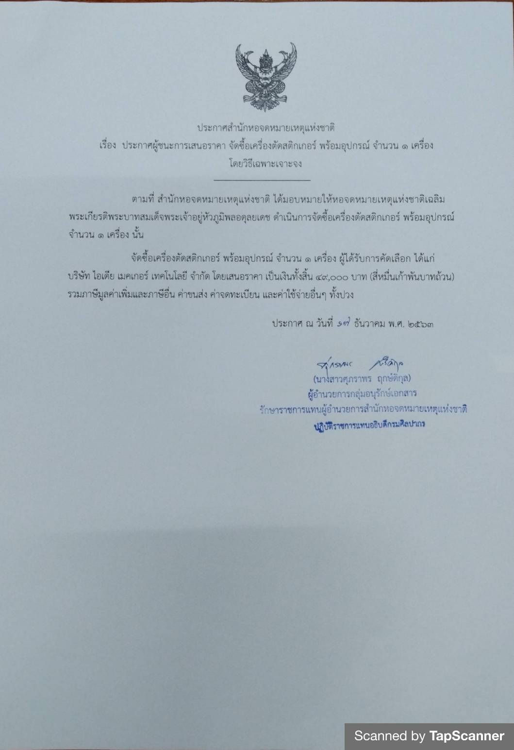 ประกาศสำนักหอจดหมายเหตุแห่งชาติ เรื่อง ประกาศผู้ชนะการเสนอราคา จัดซื้อเครื่องตัดสติกเกอร์ พร้อมอุปกรณ์ จำนวน ๑ เครื่อง โดยวิธีเฉพาะเจาะจง