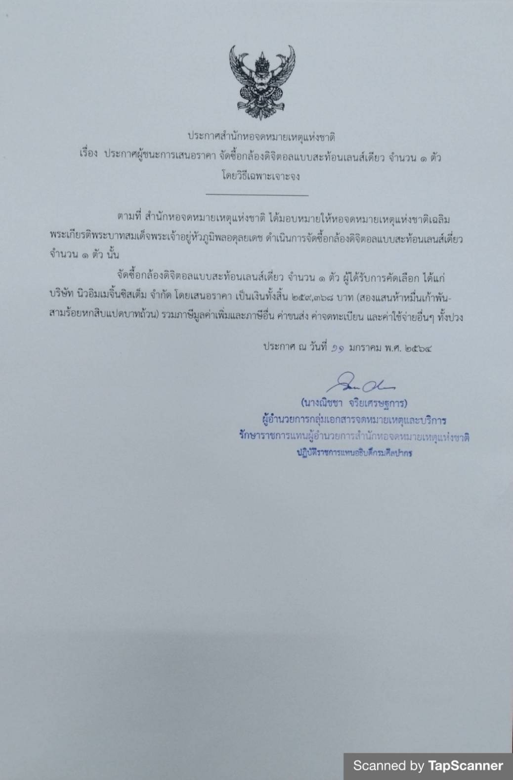 ประกาศสำนักหอจดหมายเหตุแห่งชาติ เรื่อง ประกาศผู้ชนะการเสนอราคา จัดซื้อกล้องดิจิตอลแบบสะท้อนเลนส์เดียว จำนวน ๑ ตัว โดยวิธีเฉพาะเจาะจง
