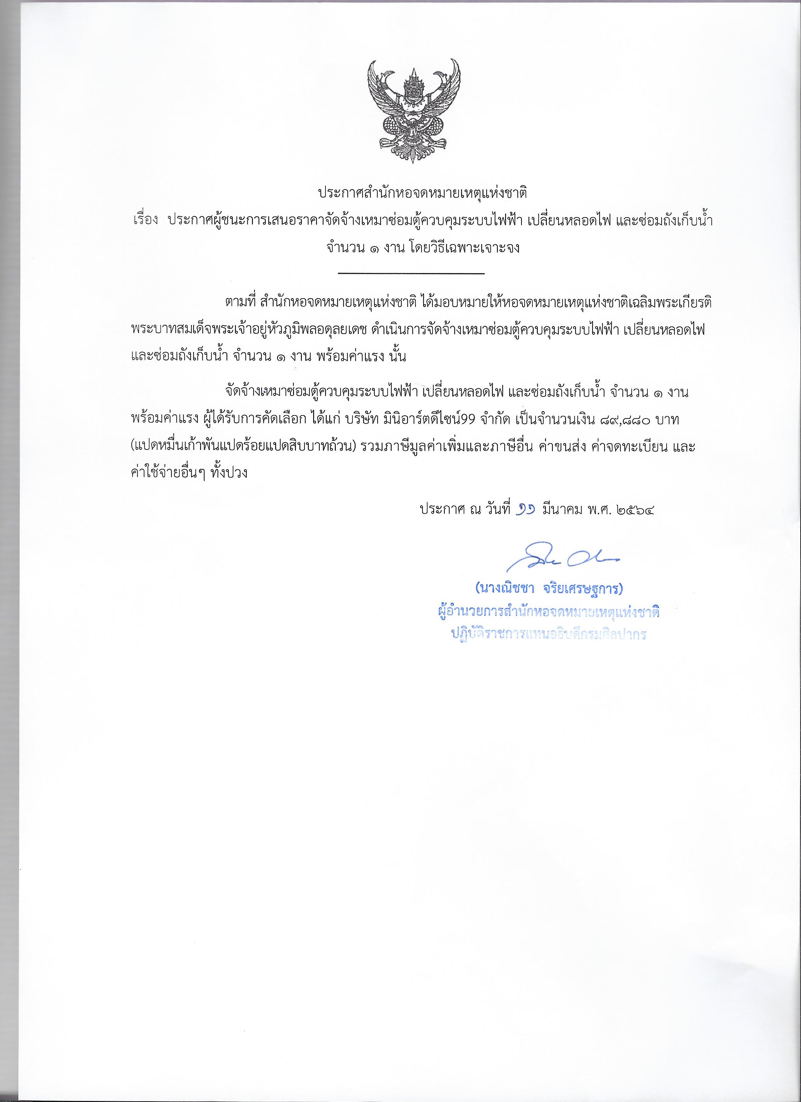 ประกาศสำนักหอจดหมายเหตุแห่งชาติ เรื่อง ประกาศผู้ชนะการเสนอราคาจัดจ้างเหมาซ่อมตู้ควบคุมระบบไฟฟ้า เปลี่ยนหลอดไฟ และซ่อมถังเก็บน้ำ จำนวน ๑ งาน โดยวิธีเฉพาะเจาะจง