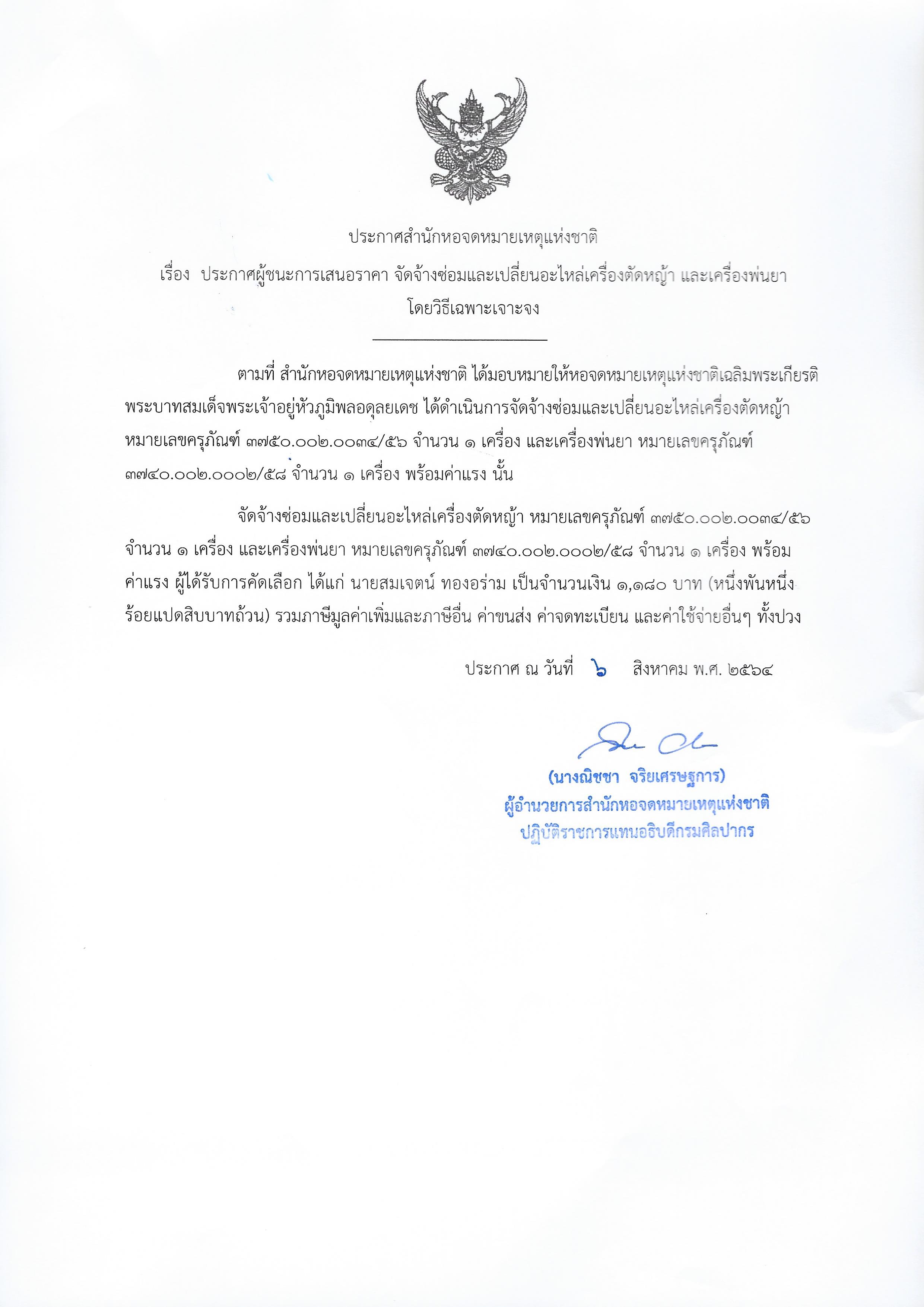 ประกาศสำนักหอจดหมายเหตุแห่งชาติ เรื่อง ประกาศผู้ชนะการเสนอราคา จัดจ้างซ่อมและเปลี่ยนอะไหล่เครื่องตัดหญ้า และเครื่องพ่นยา โดยวิธีเฉพาะเจาะจง