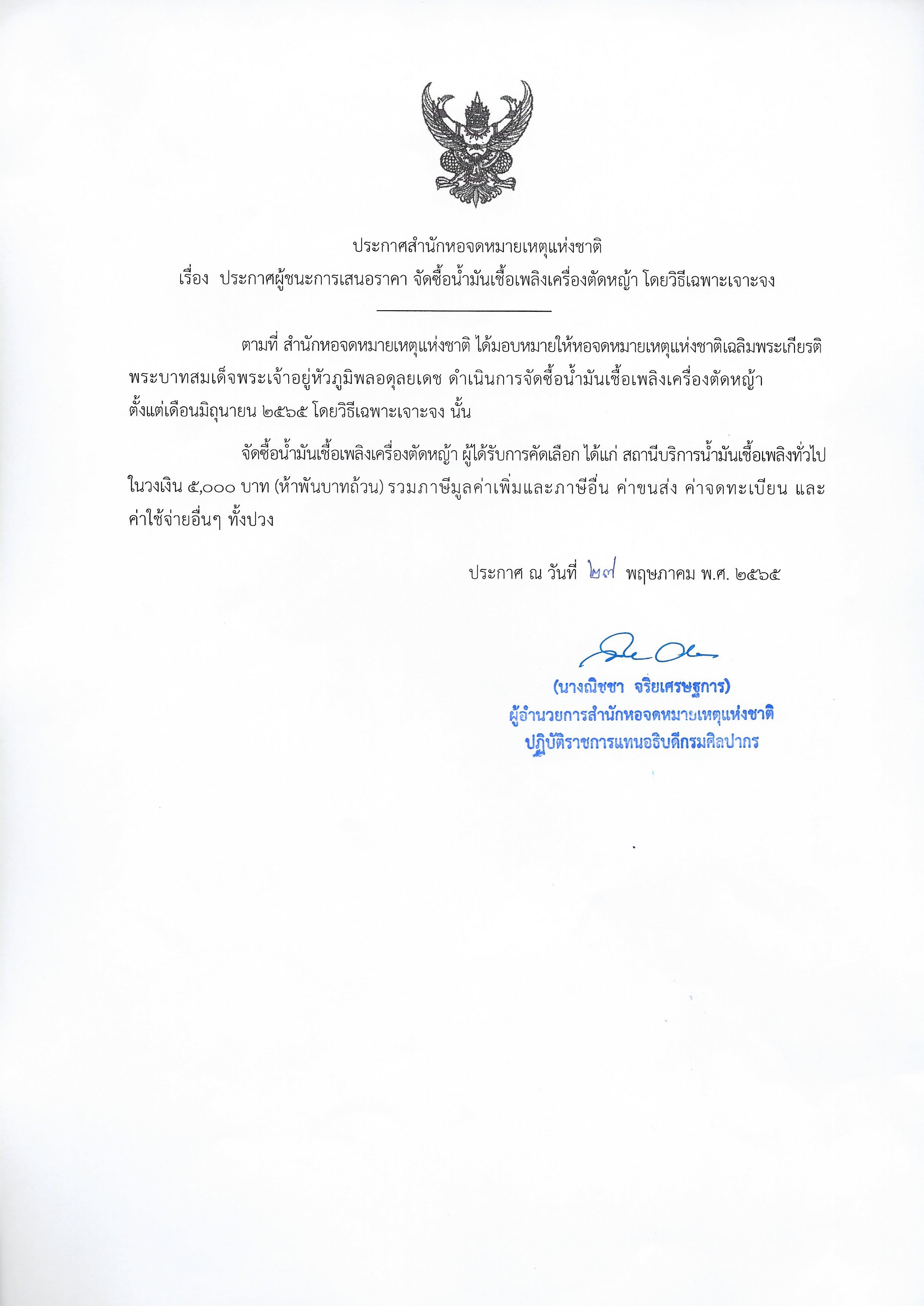 ประกาศสำนักหอจดหมายเหตุแห่งชาติ เรื่องประกาศผู้ชนะการเสนอราคาจัดซื้อน้ำมันเชื้อเพลิงเครื่องตัดหญ้า โดยวิธีเฉพาะเจาะจง