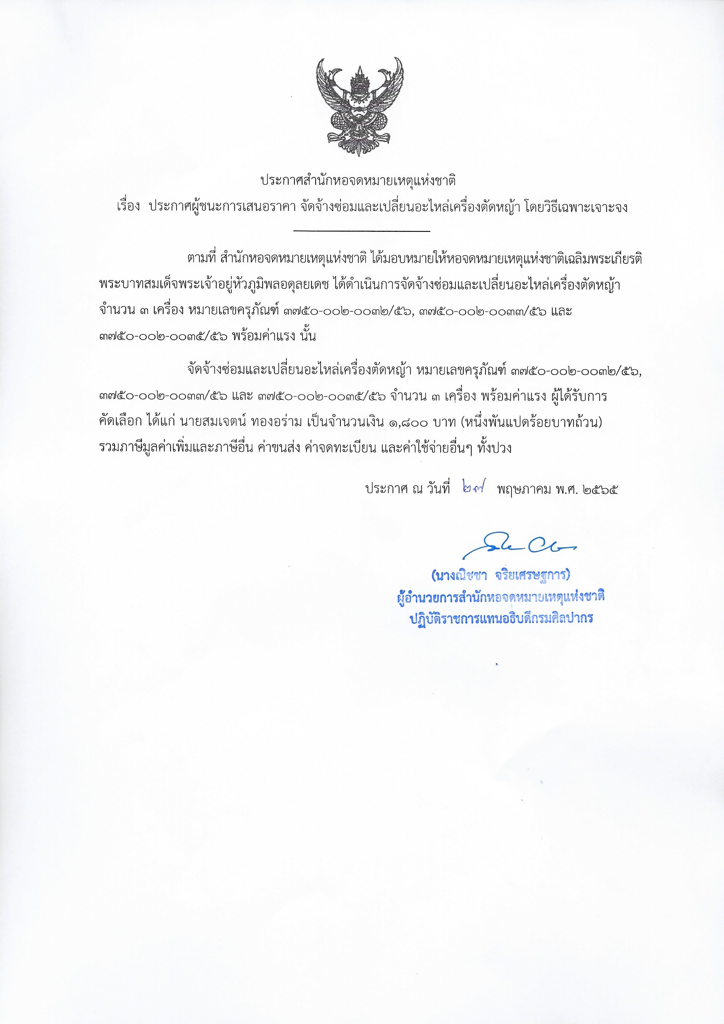 ประกาศสำนักหอจดหมายเหตุแห่งชาติ เรื่องประกาศผู้ชนะการเสนอราคาจ้างเหมาซ่อมและเปลี่ยนอะไหล่เครื่องตัดหญ้า โดยวิธีเฉพาะเจาะจง