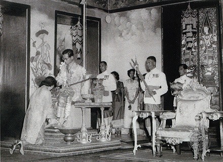 พุทธศักราช ๒๔๙๓ สมเด็จพระเจ้าอยู่หัวภูมิพลอดุลยเดชเสด็จนิวัตพระนครเพื่อถวายพระเพลิงพระบรมศพพระบาทสมเด็จพระเจ้าอยู่หัวอานันทมหิดล ทรงพระกรุณาโปรดเกล้าฯ ให้หม่อมราชวงศ์สิริกิติ์ กิติยากร ตามเสด็จด้วย และต่อมาเมื่อวันศุกร์ที่ ๒๘ เมษายน พุทธศักราช ๒๔๙๓ ได้จัดพระราชพิธีราชาภิเษกสมรส ณ วังสระปทุม โดยสมเด็จพระศรีสวรินทิราบรมราชเทวี พระพันวัสสาอัยยิกาเจ้า ทรงเป็นประธานในพระราชพิธี ในการนี้ หม่อมราชวงศ์สิริกิติ์ กิติยากร ได้รับการสถาปนาเป็น สมเด็จพระราชินีสิริกิติ์