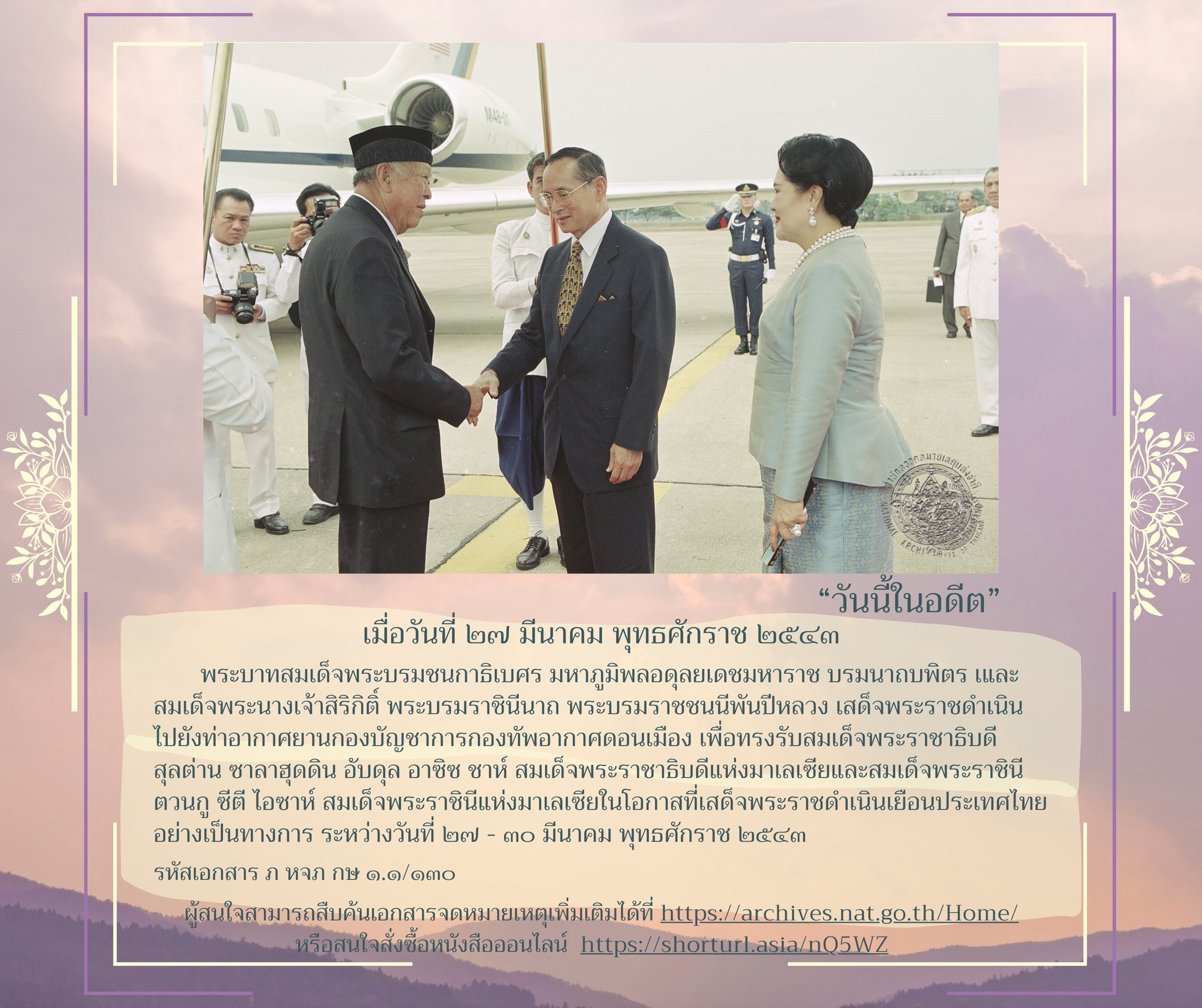 พระบาทสมเด็จพระบรมชนกาธิเบศร มหาภูมิพลอดุลยเดชมหาราช บรมนาถบพิตร และสมเด็จพระนางเจ้าสิริกิติ์ พระบรมราชินีนาถ พระบรมราชชนนีพันปีหลวง เสด็จพระราชดำเนินไปยังท่าอากาศยานกองบัญชาการกองทัพอากาศดอนเมือง เพื่อทรงรับสมเด็จพระราชาธิบดี สุลต่าน ซาลาฮุดดิน อับดุล อาซิซ ชาห์ สมเด็จพระราชาธิบดีแห่งมาเลเซีย และสมเด็จพระราชินี ตวนกู ซีตี ไอซาห์ สมเด็จพระราชินีแห่งมาเลเซีย ในโอกาสที่เสด็จพระราชดำเนินเยือนประเทศไทยอย่างเป็นทางการ ระหว่างวันที่ ๒๗ - ๓๐ มีนาคม พุทธศักราช ๒๕๔๓