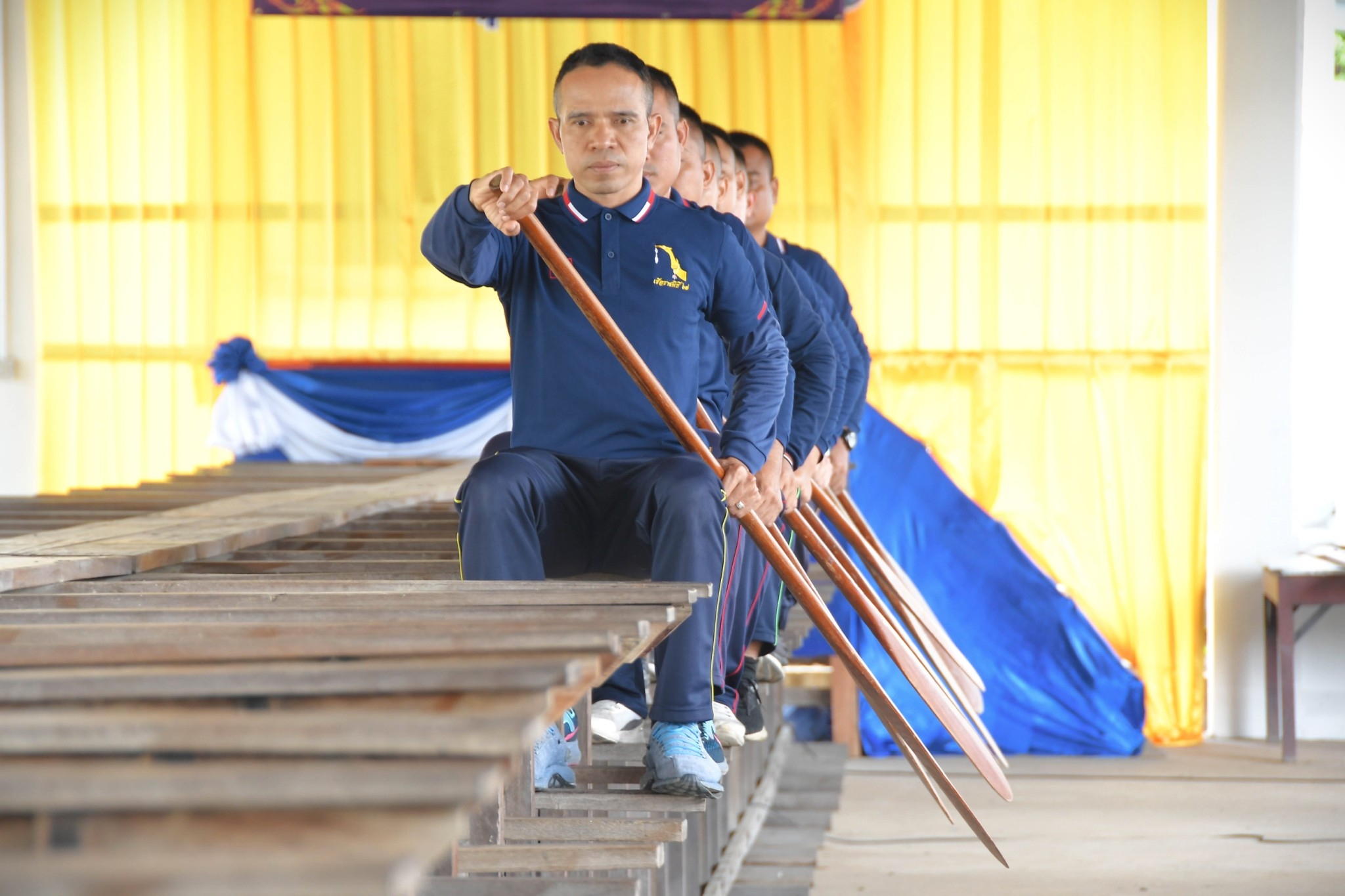 การฝึกอบรมพายเรือบนบก คือการฝึกพายเรือบน “เขียงฝึก” ซึ่งเป็นอุปกรณ์ที่ใช้ในการฝึกฝนท่าทางการปฏิบัติของกำลังพลฝีพายก่อนที่จะลงเรือจริง ทำให้กำลังพลฝีพายเกิดความคุ้นชิน สามารถจัดระเบียบร่างกายได้อย่างถูกต้องพร้อมเพรียงและเป็นไปในทิศทางเดียวกัน เขียงฝึกที่ใช้ในการฝึกนี้ เรียกว่า เขียงไม้ มีลักษณะเป็นไม้กระดานต่อกันสูงขึ้นเหนือจากพื้น โดยจำลองโครงสร้างให้คล้ายคลึงกับเรือพระราชพิธี ส่วนที่กำลังพลฝีพายใช้นั่ง เรียกว่า “กระทง” ซึ่งเป็นไม้กระดานหน้าเรียบ วางเรียงกันในแนวขวาง แบ่งช่องว่างเป็นตอน ๆ ด้วยระยะห่างเท่ากันเหมือนกับกระทงยึดกราบเรือ ด้านล่างกระทงต่อไม้สำหรับกำลังพลฝีพายวางและยันเท้า เรียกว่า “ไม้วางเท้า” ด้านบนตรงกลางกระทรงวางไม้ทับเป็นแนวยาว เรียกว่า “ไม้ทับกระทง”