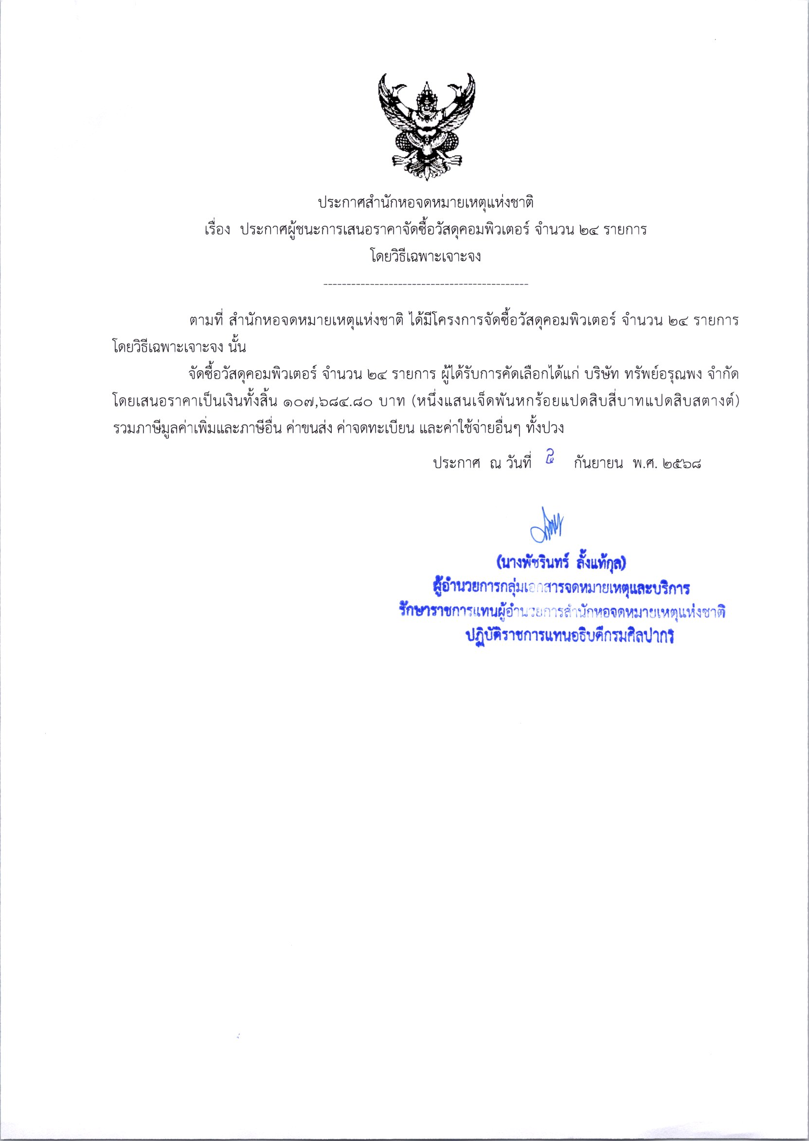 ประกาศสำนักหอจดหมายเหตุแห่งชาติ เรื่องประกาศผู้ชนะการเสนอราคาจัดซื้อวัสดุคอมพิวเตอร์ โดยวิธีเฉพาะเจาะจง เป็นเงิน 107,684.80 บาท