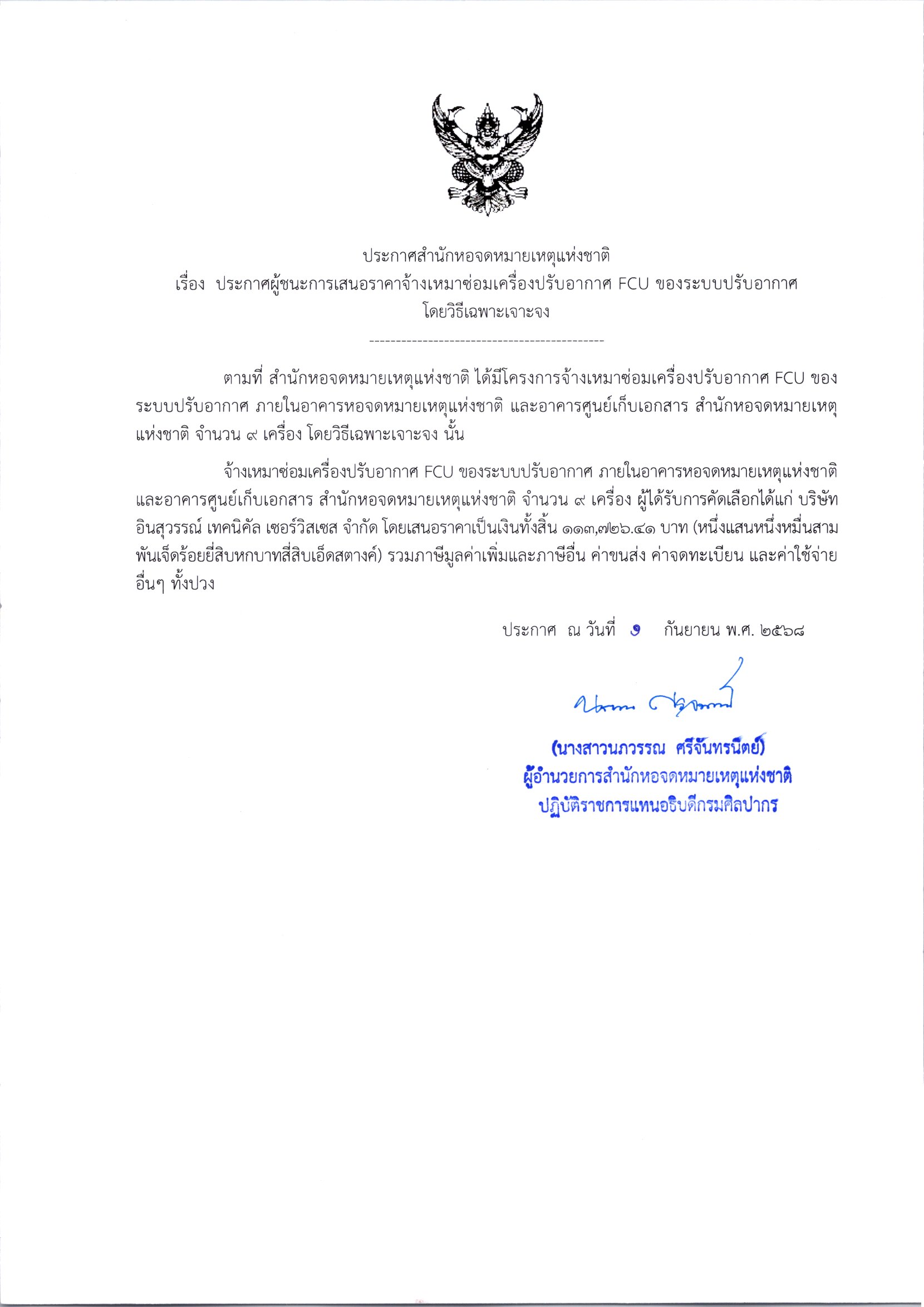 ประกาศสำนักหอจดหมายเหตุแห่งชาติ เรื่องประกาศผู้ชนะการเสนอราคาจ้างเหมาซ่อมระบบปรับอากาศ FCU ของระบบปรับอากาศ โดยวิธีเฉพาะเจาะจง เป็นเงิน 113,726.41 บาท
