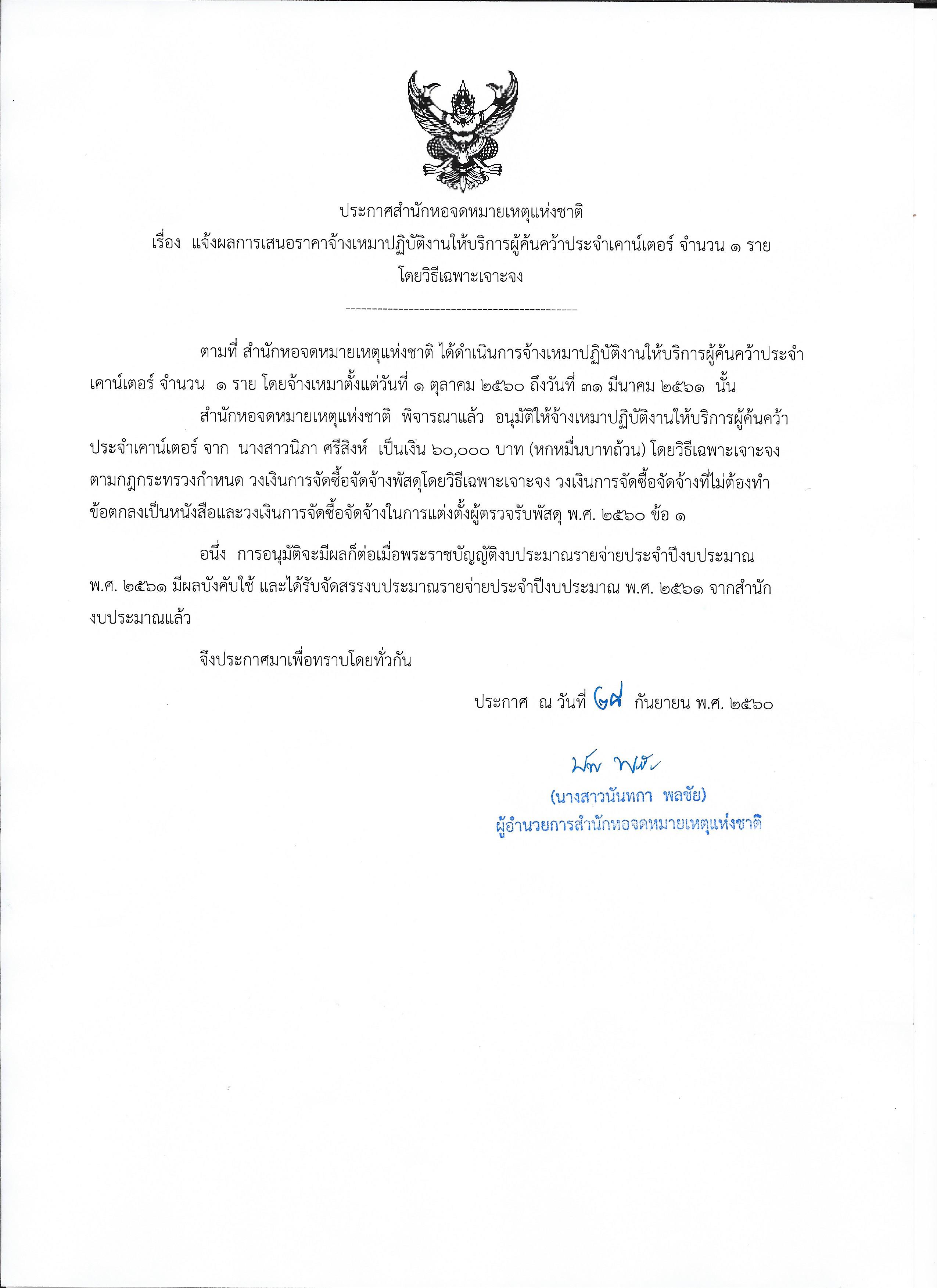 แจ้งผลการเสนอราคาจ้างเหมาปฏิบัติงานให้บริการผู้ค้นคว้าประจำเคาน์เตอร์ จำนวน 1 ราย โดยวิธีเฉพาะเจาะจง