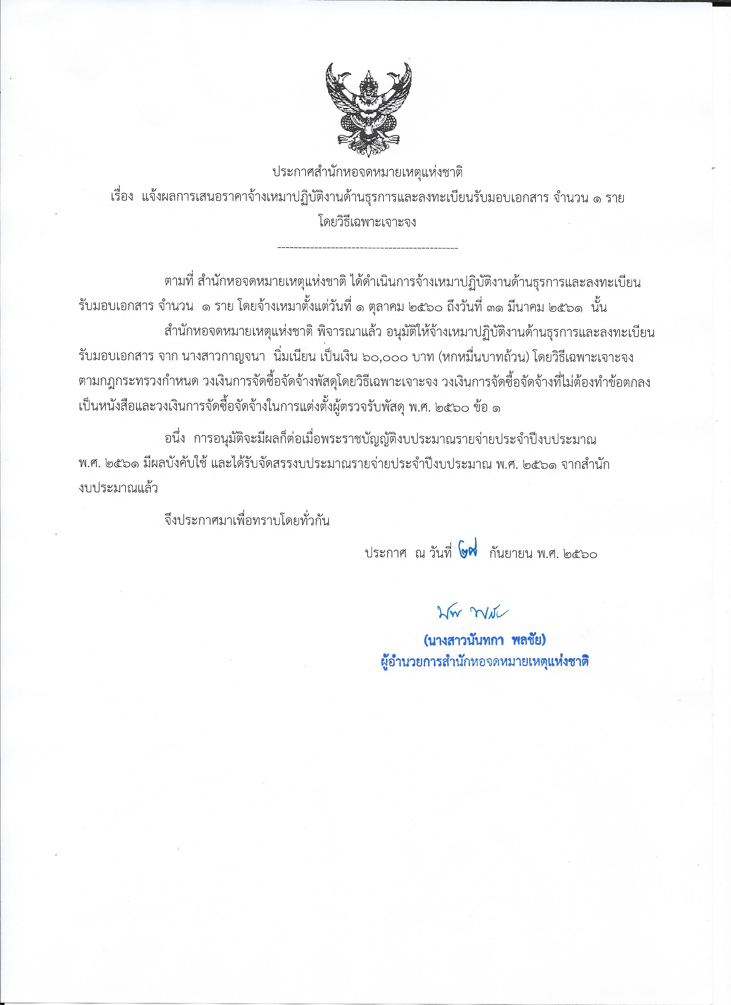 แจ้งผลการเสนอราคาจ้างเหมาปฏิบัติงานด้านธุรการและลงทะเบียนรับมอบเอกสาร จำนวน 1 ราย โดยวิธีเฉพาะเจาะจง