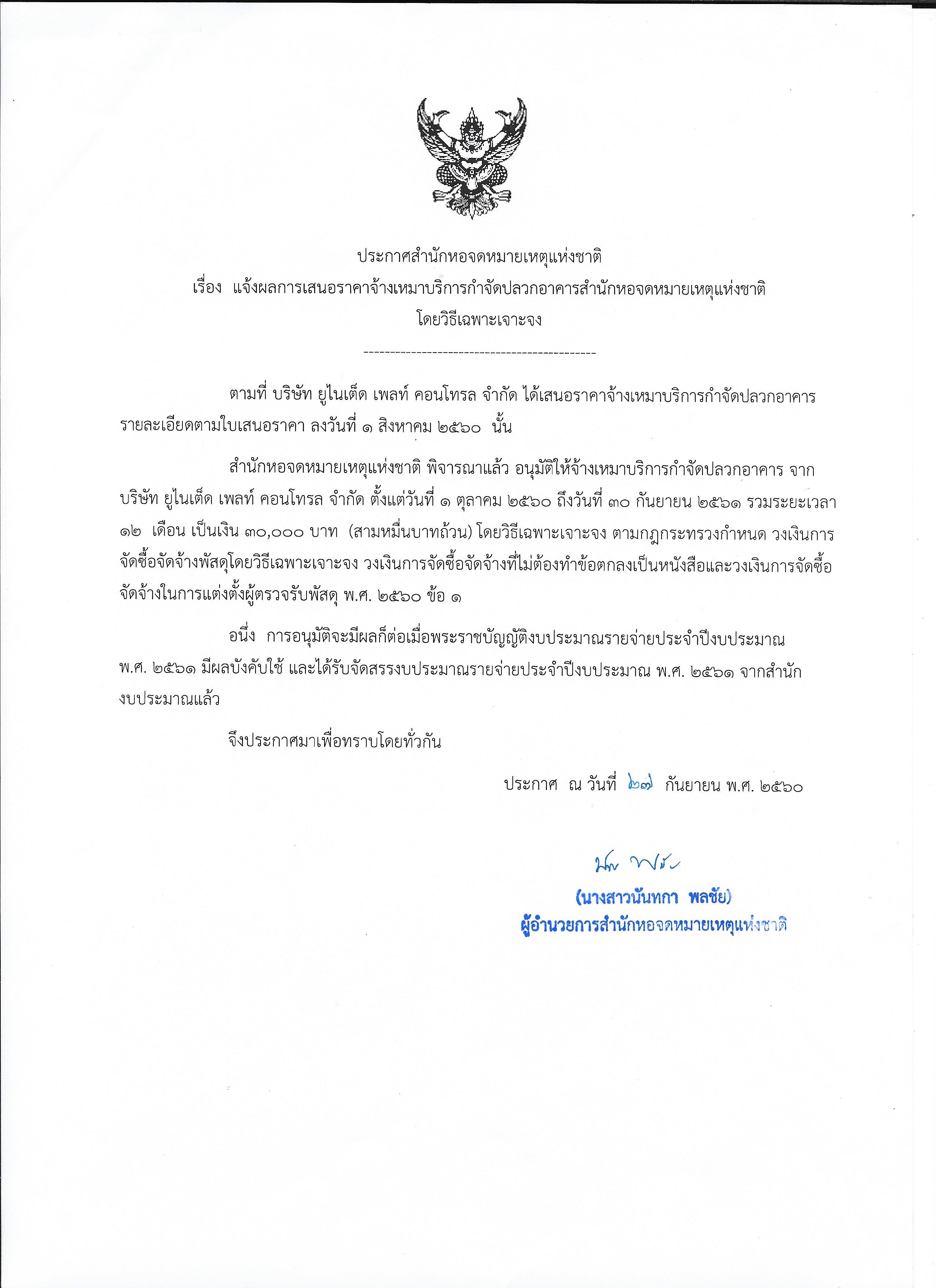 แจ้งผลการเสนอราคาจ้างเหมาบริการกำจัดปลวกอาคารสำนักหอจดหมายเหตุแห่งชาติ