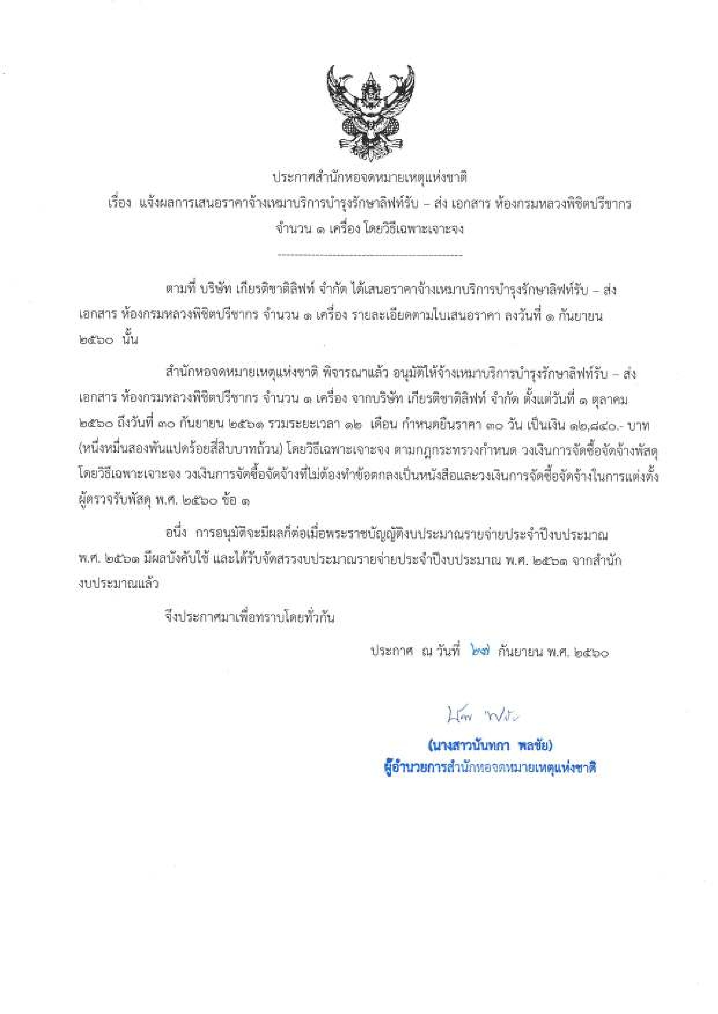 แจ้งผลการเสนอราคาจ้างเหมาบริการบำรุงรักษาลิฟท์รับ - ส่ง เอกสาร ห้องกรมหลวงพิชิตปรีชากร จำนวน 1 เครื่อง โดยวิธีเฉพาะเจาะจง