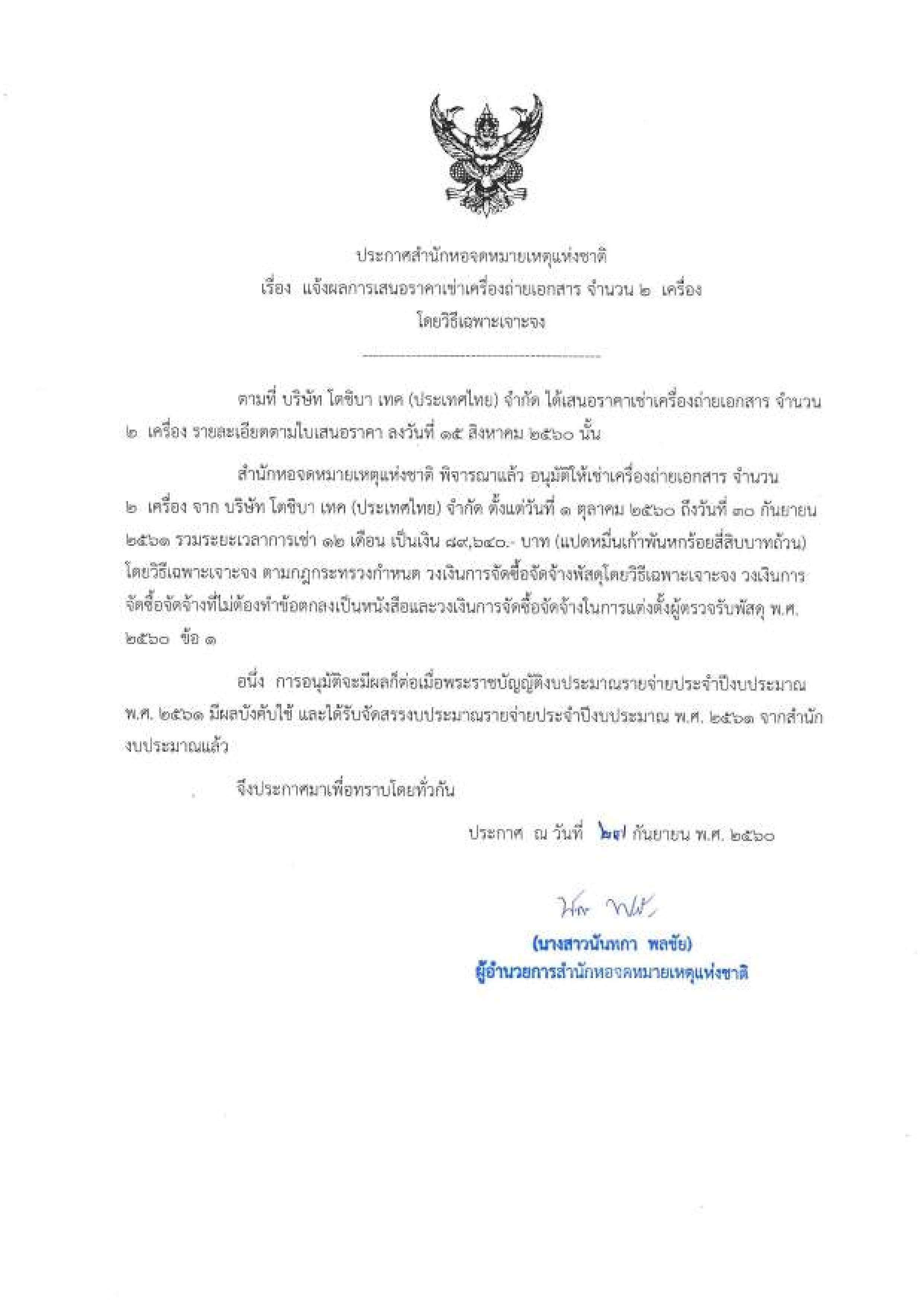 แจ้งผลการเสนอราคาเช่าเครื่องถ่ายเอกสาร จำนวน 2 เครื่อง โดยวิธีเฉพาะเจาะจง