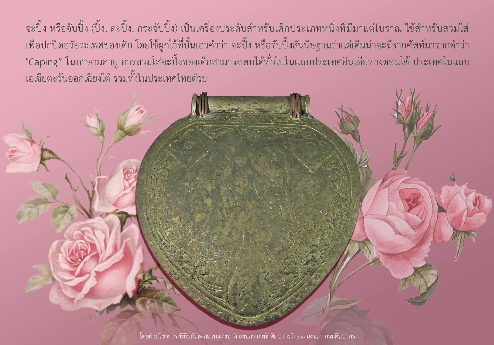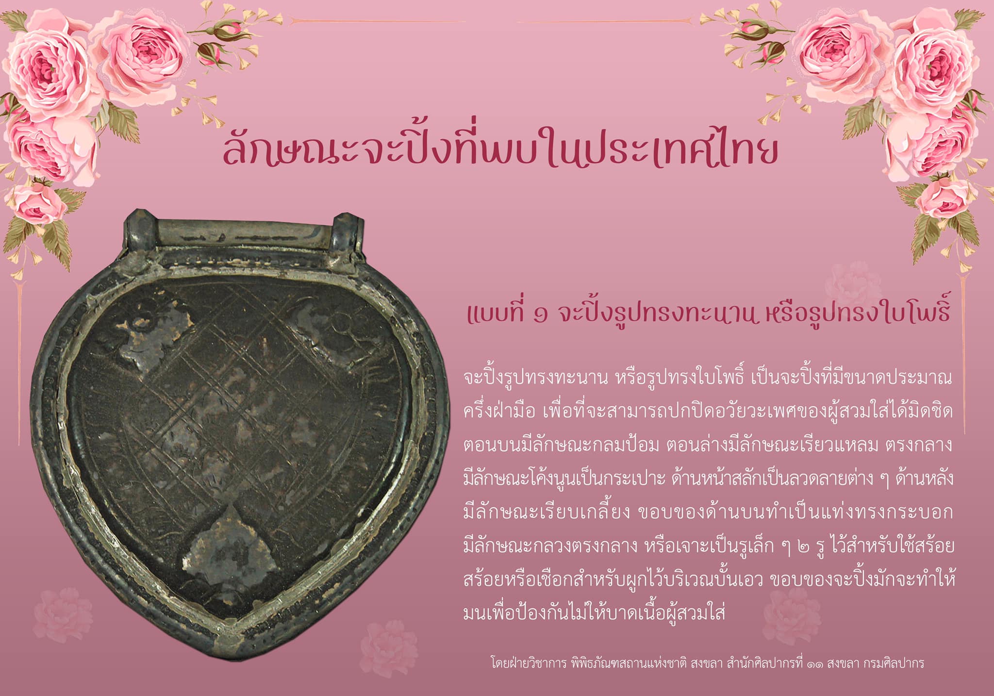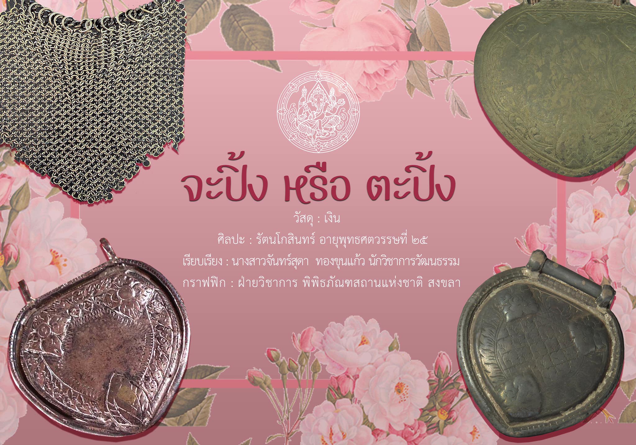 ในบริเวณคาบสมุทรสทิงพระและบริเวณลุ่มน้ำทะเลสาบสงขลา จะปิ้งที่พบส่วนใหญ่เป็นจะปิ้งที่สร้างขึ้นในสมัยรัตนโกสินทร์ อายุประมาณพุทธศตวรรษที่ 25 รูปแบบที่พบมีทั้งที่เป็นจะปิ้งรูปทรงทะนาน หรือจะปิ้งรูปทรงใบโพธิ์ และจะปิ้งรูปทรงร่างแห วัสดุที่ใช้ทำจะปิ้งมีทั้งที่ทำจากทอง เงิน นาก และกะลามะพร้าว ส่วนลวดลายของจะปิ้งที่พบส่วนใหญ่เป็นลายพันธุ์พฤกษา ลายประจำยาม ลายกระจังตาอ้อย ลายกระจังปฏิญาณ ลายพุ่มข้าวบิณฑ์ และลายกระหนก
