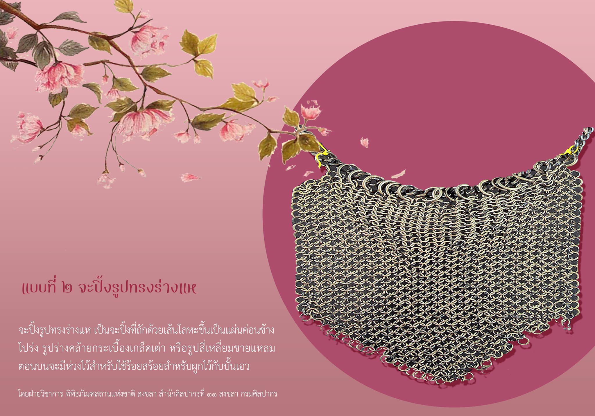 2. จะปิ้งรูปทรงร่างแห เป็นจะปิ้งที่ถักด้วยเส้นโลหะขึ้นเป็นแผ่นค่อนข้างโปร่ง รูปร่างคล้ายกระเบื้องเกล็ดเต่า หรือรูปสี่เหลี่ยมชายแหลม ตอนบนจะมีห่วงไว้สำหรับใช้ร้อยสร้อยสำหรับผูกไว้กับบั้นเอว
