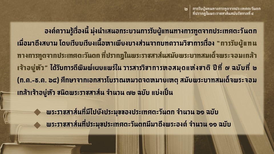 องค์ความรู้ เรื่อง “ชวนอ่านวารสารวิชาการหอสมุดแห่งชาติ: การรับผู้แทนทางการทูตจากประเทศตะวันตกที่ปรากฏในพระราชสาส์นสมัยพระบาทสมเด็จพระจอมเกล้าเจ้าอยู่หัว”