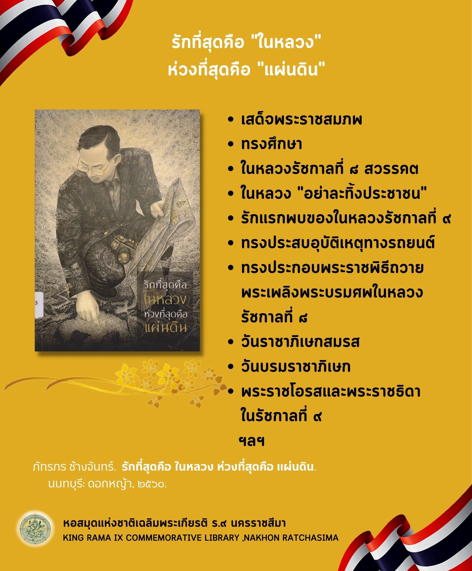 นามศัพท์ “ในหลวง” เป็นคำที่ใช้เพื่อหมายถึงพระมหากษัตริย์อันเป็นที่รักและเคารพยิ่งของคนไทยในรัชสมัยพระบาทสมเด็จพระปรมินทรมหาภูมิพลอดุลยเดช พระองค์คือในหลวงที่ปวงชนชาวไทยรักและเทิดทูนอย่างสูงสุด พระองค์ทรงมีพระมหากรุณาธิคุณเป็นล้นพ้นแก่ทวยราษฎร์อย่างหาที่สุดมิได้ ทรงทุ่มเทกำลังพระวรกาย พระราชหฤทัยอย่างไม่ย่อท้อต่อความเหน็ดเหนื่อยมาตลอด 70 ปี แห่งการครองราชย์ เพื่อทรงแก้ปัญหาและพัฒนาคุณภาพชีวิตความเป็นอยู่ของพสกนิกรให้ดียิ่งขึ้น หนังสือเล่มนี้ รวบรวมพระราชประวัติของพระบาทสมเด็จพระปรมินทรมหาภูมิพลอดุลยเดช รัชกาลที่ 9 ที่โดดเด่นอยู่ในความทรงจำของประชาชนชาวไทย การต้อนรับอาคันตุกะระหว่างประเทศที่สำคัญ เพื่อน้อมรำลึกในพระมหากรุณาธิคุณพระบาทสมเด็จพระปรมินทรมหาภูมิพลอดุลยเดชมหาราช บรมนาถบพิตร เนื่องในวันคล้ายวันพระราชสมภพ 5 ธันวาคม 2565 วันชาติและวันพ่อแห่งชาติ หอสมุดแห่งชาติเฉลิมพระเกียรติ ร.9 นครราชสีมา ได้จัดแสดงหนังสือที่เกี่ยวข้องกับพระองค์ท่าน หากท่านใดสนใจ ขอเชิญอ่านได้ที่หอสมุดแห่งชาติเฉลิมพระเกียรติ ร.9 นครราชสีมา