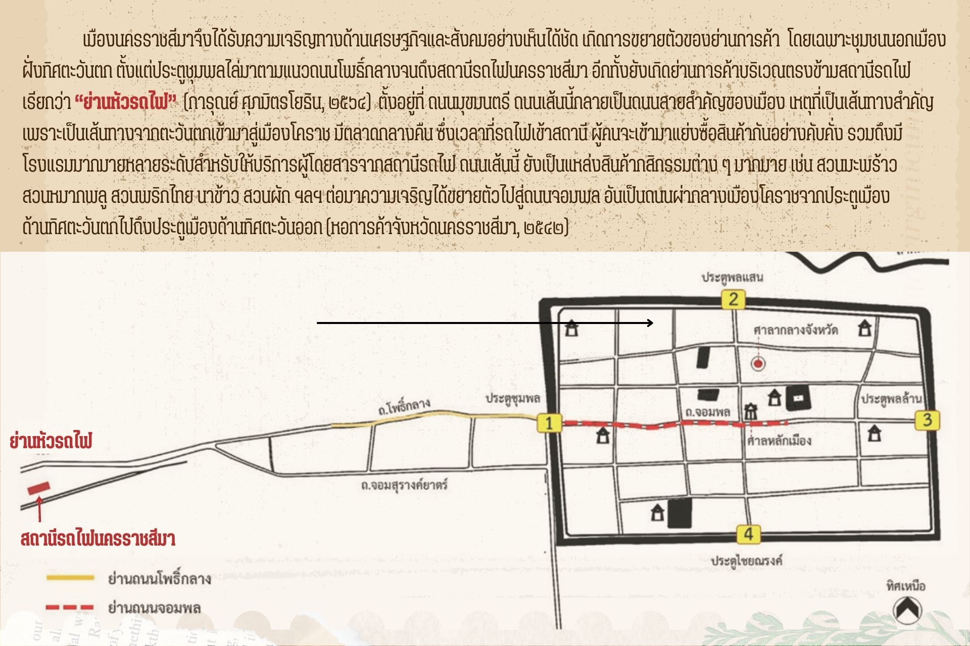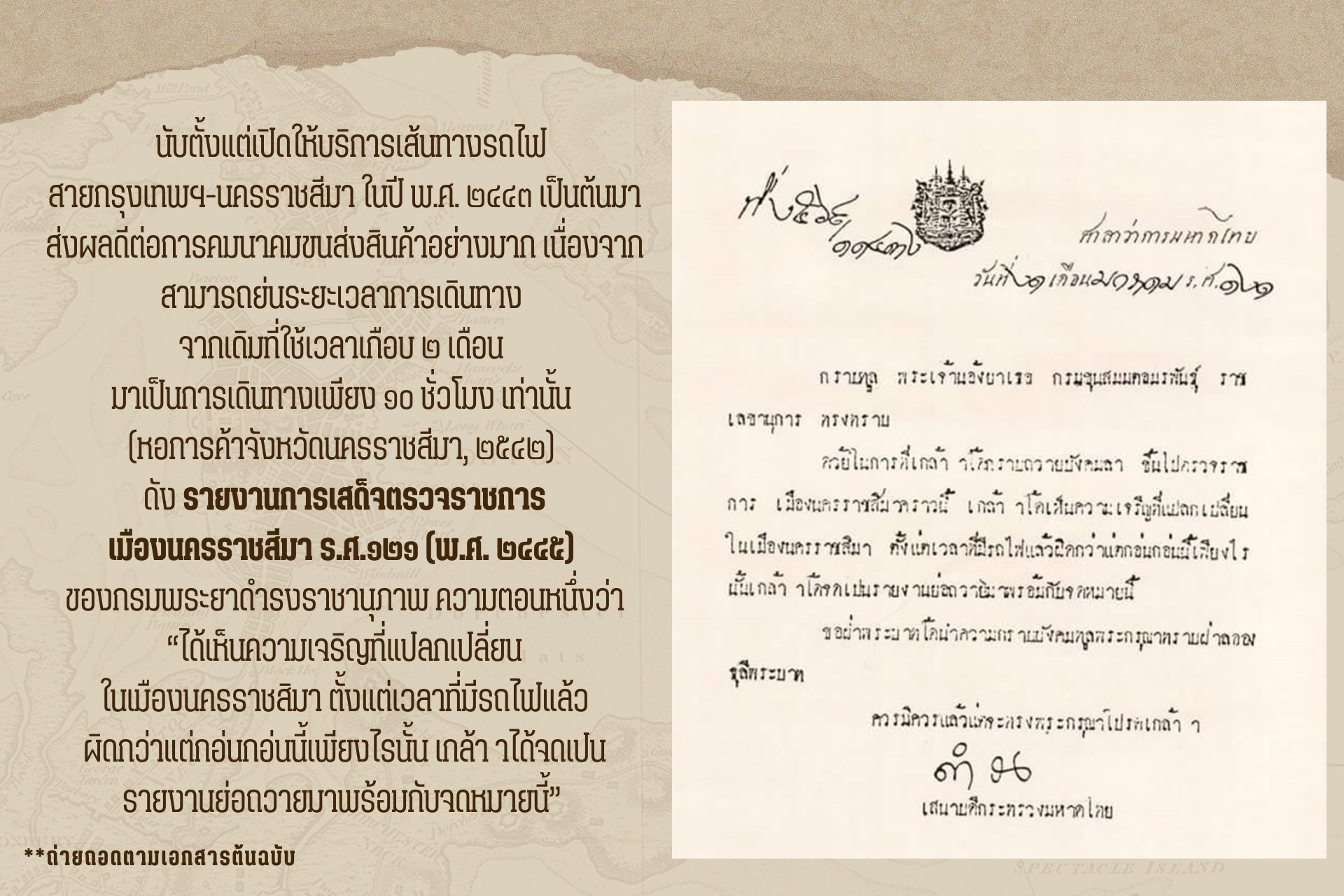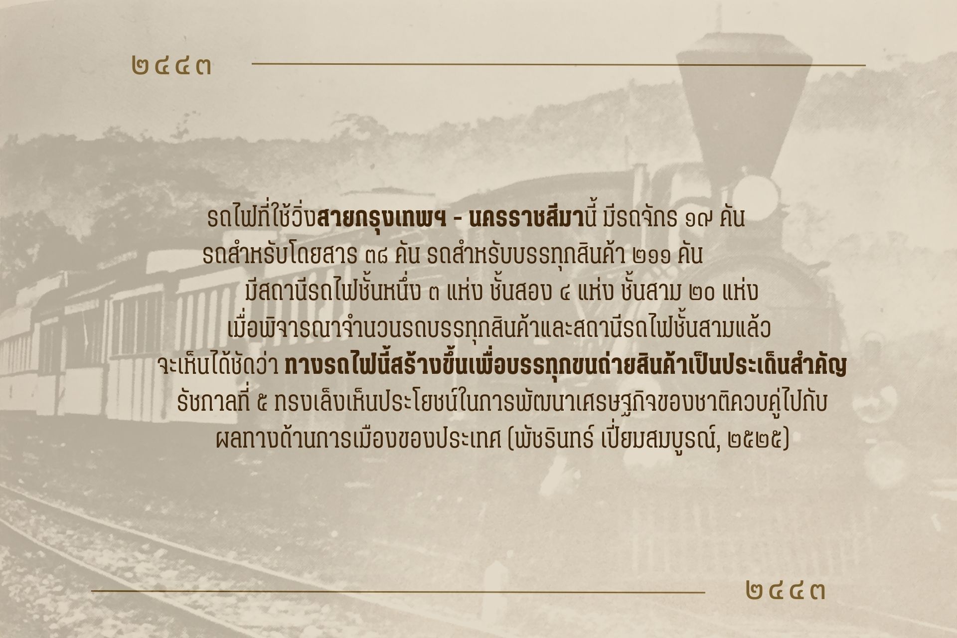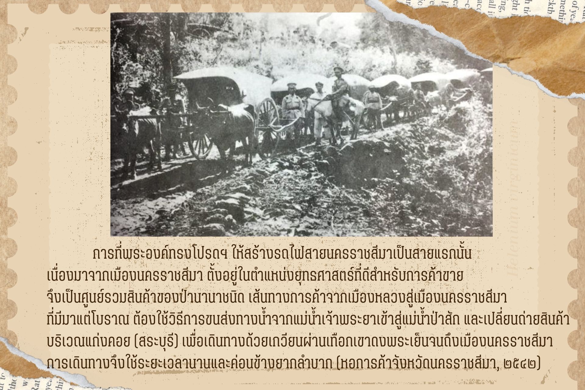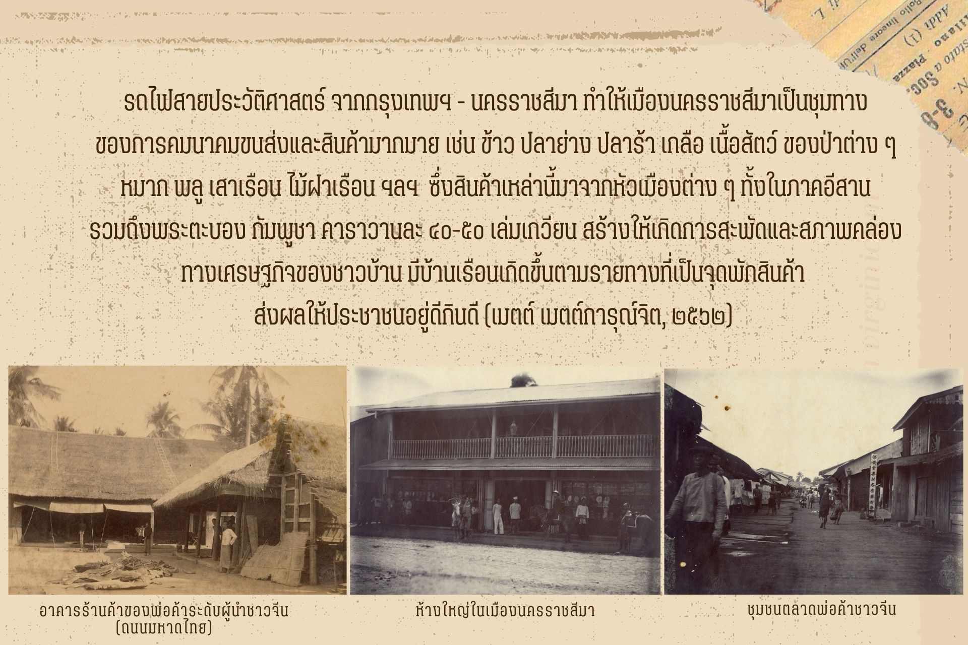 นับตั้งแต่เปิดให้บริการเส้นทางรถไฟสายกรุงเทพฯ-นครราชสีมา ในปี พ.ศ. ๒๔๔๓ เป็นต้นมาส่งผลดีต่อการคมนาคมขนส่งสินค้าอย่างมาก เนื่องจากสามารถย่นระยะเวลาการเดินทางจากเดิมที่ใช้เวลาเกือบ ๒ เดือน มาเป็นการเดินทางเพียง ๑๐ ชั่วโมง เท่านั้น (หอการค้าจังหวัดนครราชสีมา, ๒๕๔๒) ดัง รายงานการเสด็จตรวจราชการเมืองนครราชสีมา ร.ศ.๑๒๑ (พ.ศ. ๒๔๔๕) ของกรมพระยาดำรงราชานุภาพ ความตอนหนึ่งว่า “ได้เห็นความเจริญที่แปลกเปลี่ยน