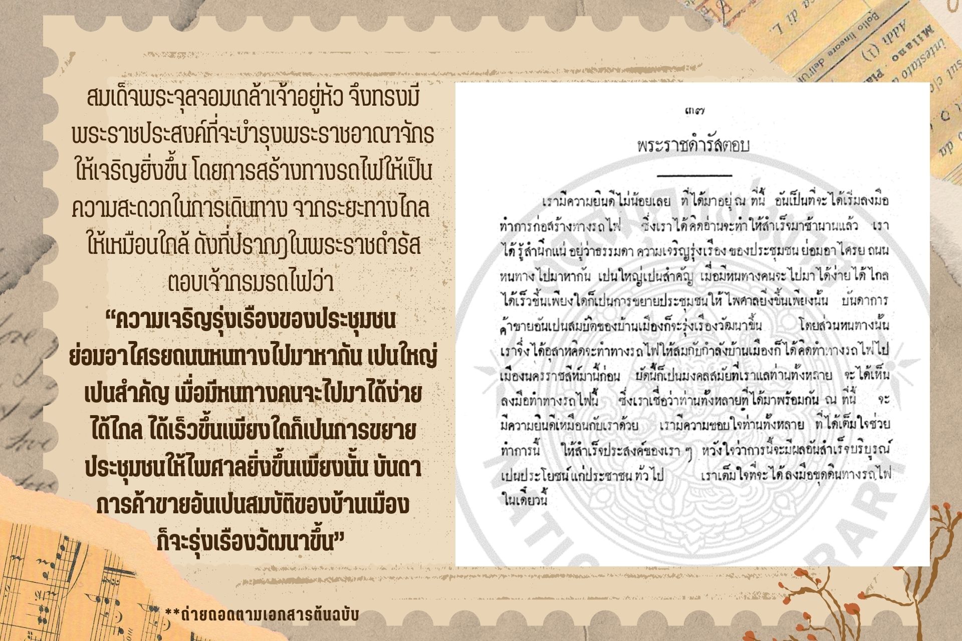 พระบาทสมเด็จพระจุลจอมเกล้าเจ้าอยู่หัวทรงมีพระราชประสงค์ที่จะบำรุงพระราชอาณาจักรให้เจริญยิ่งขึ้น โดยการสร้างทางรถไฟให้เป็นความสะดวกในการเดินทาง จากระยะทางไกลให้เหมือนใกล้ ดังที่ปรากฎในพระราชดำรัสตอบเจ้ากรมรถไฟว่า