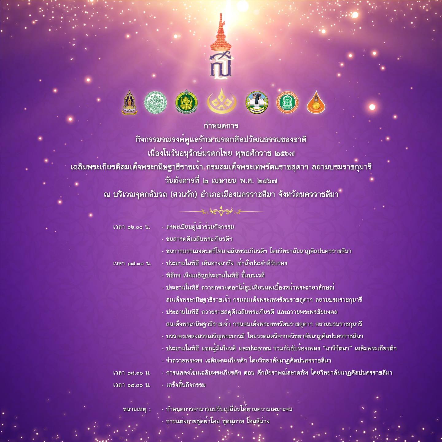 ขอเชิญร่วมกิจกรรมเนื่องในวันอนุรักษ์มรดกไทย พุทธศักราช ๒๕๖๗ เฉลิมพระเกียรติสมเด็จพระกนิษฐาธิราชเจ้า กรมสมเด็จพระเทพรัตนราชสุดา ฯ สยามบรมราชกุมารี