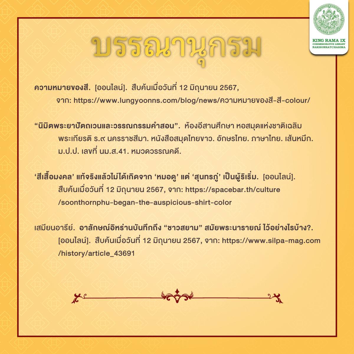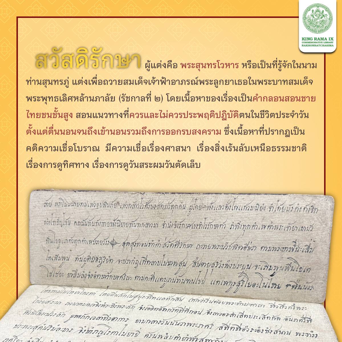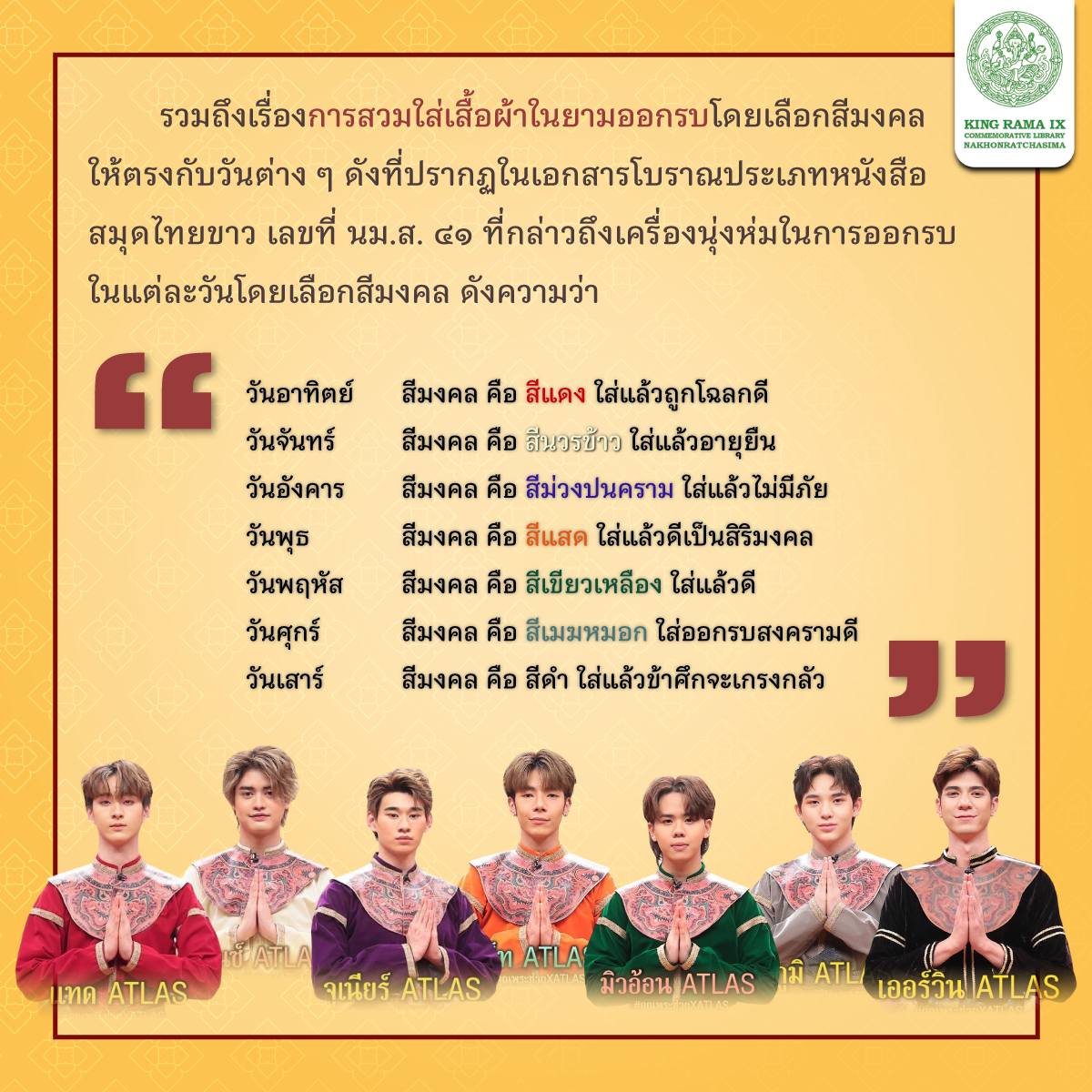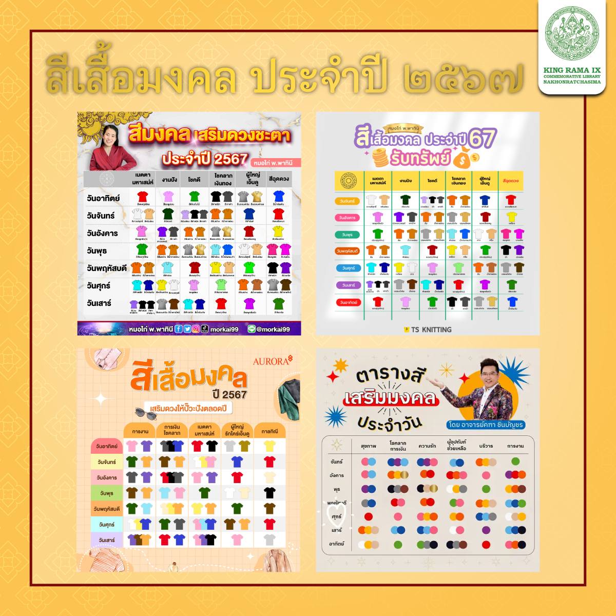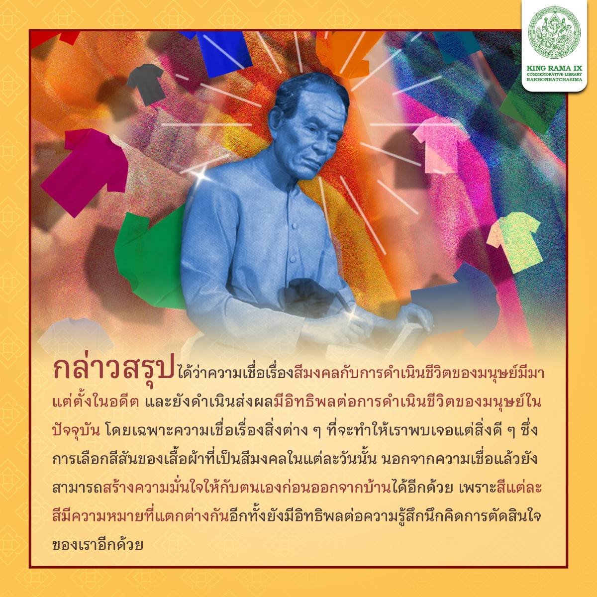 องค์ความรู้ สวัสดิรักษา : สีมงคลศาสตร์ของนักรบ" ซึ่งสวัสดิรักษาคำกลอนนี้แต่งโดยพระสุนทรโวหาร (ภู่) เป็นคำกลอนสอนเกี่ยวกับชายไทยชนชั้นสูง สอนแนวทางที่ควรและไม่ควรประพฤติปฏิบัติตนเพื่อให้เกิดสวัสดิมงคลแก่ตนเอง โดยยกเรื่องสีเสื้อมงคลในการออกศึกสงครามทั้ง ๗ วัน ตามคติความเชื่อของคนโบราณนั้นเอง ซึ่งความเชื่อนี้ก็ยังคงมีอิทธิพลตั้งแต่อดีตมาจนถึงปัจจุบัน เห็นได้จากการที่มีหมอดูชื่อดังต่าง ๆ คอยมาเผยสีเสื้อมงคลประจำวันเป็นประจำในทุก ๆ ปี เพื่อเสริมสิริมงคลในด้านต่าง ๆ และเพิ่มความมั่นใจ(ให้กับสายมู )ก่อนออกจากบ้าน
