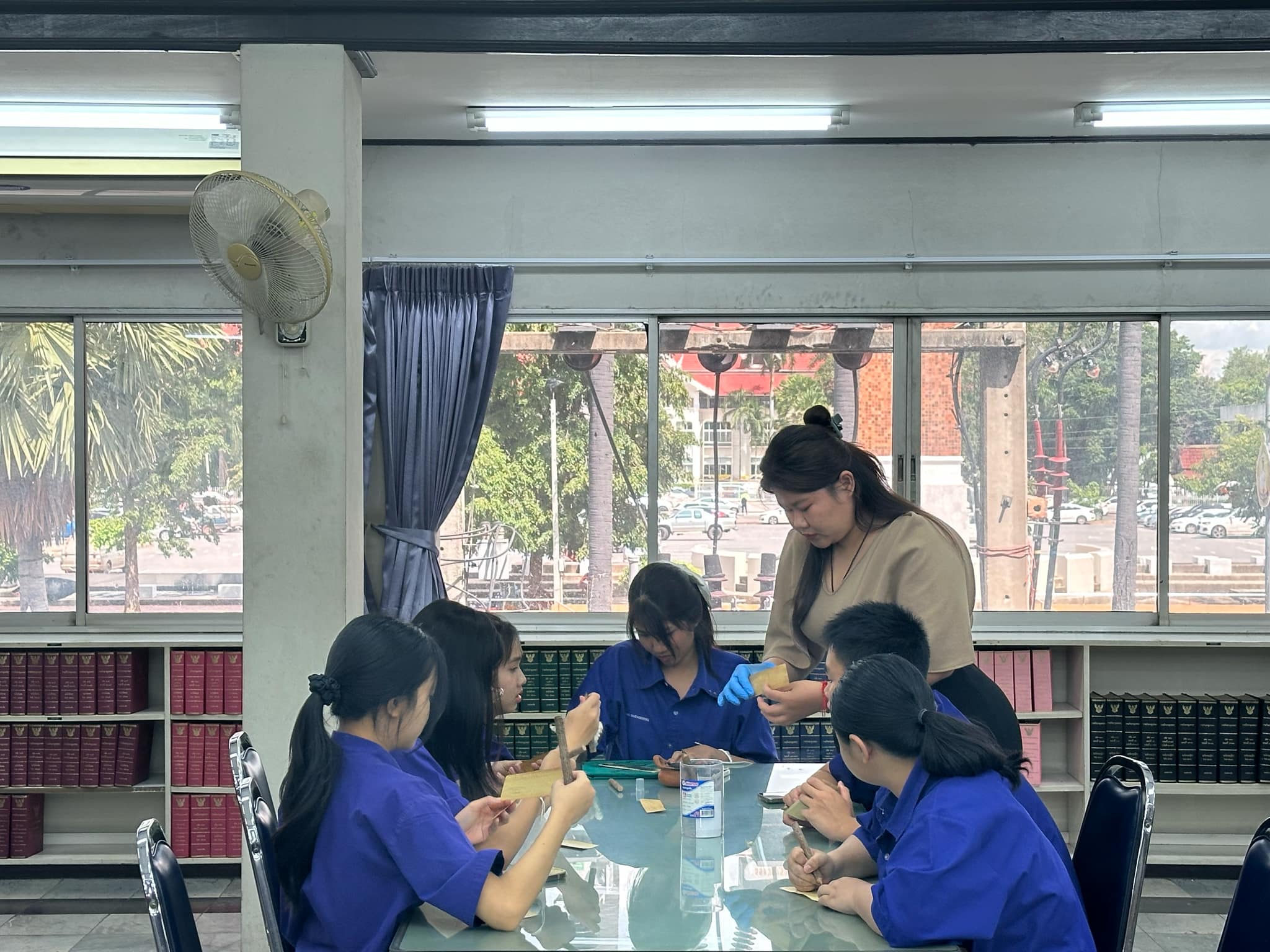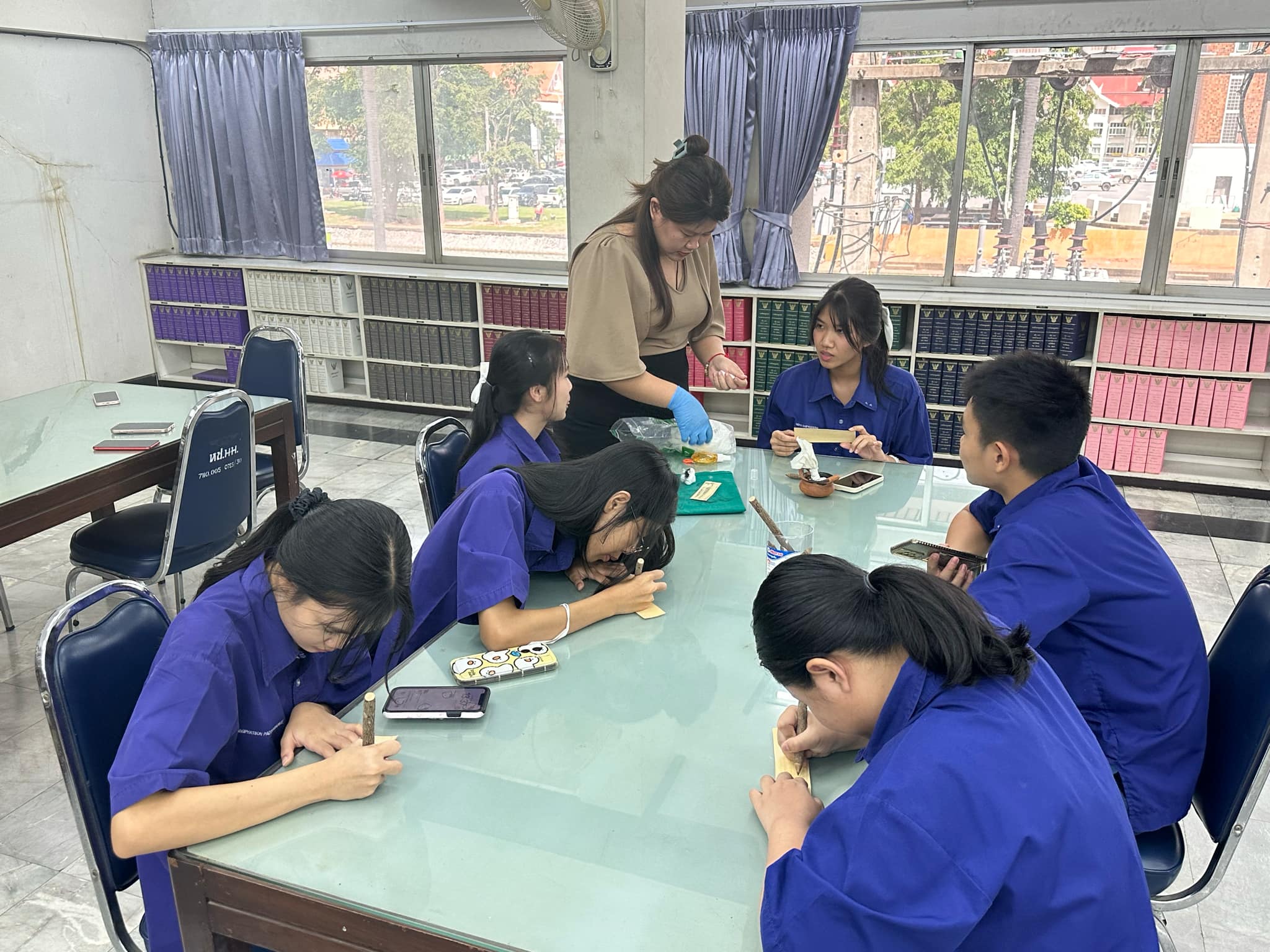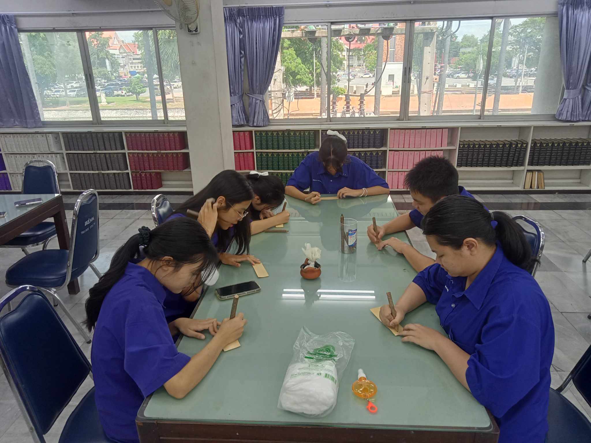 วันที่ 2 ตุลาคม 2567 นางสาวกุลริศา รัชตะวุฒิ นักภาษาโบราณ นำชมเอกสารโบราณภายในห้องอีสานศึกษา ณ หอสมุดแห่งชาติเฉลิมพระเกียรติ ร.๙ นครราชสีมา แก่นักเรียนชั้น ม.5 จากโรงเรียนมารีย์วิทยา จำนวน 6 คน นอกจากนี้ ยังได้พาน้อง ๆ นักเรียนร่วมทำกิจกรรมจารใบลานกับพี่นักภาษาโบราณ