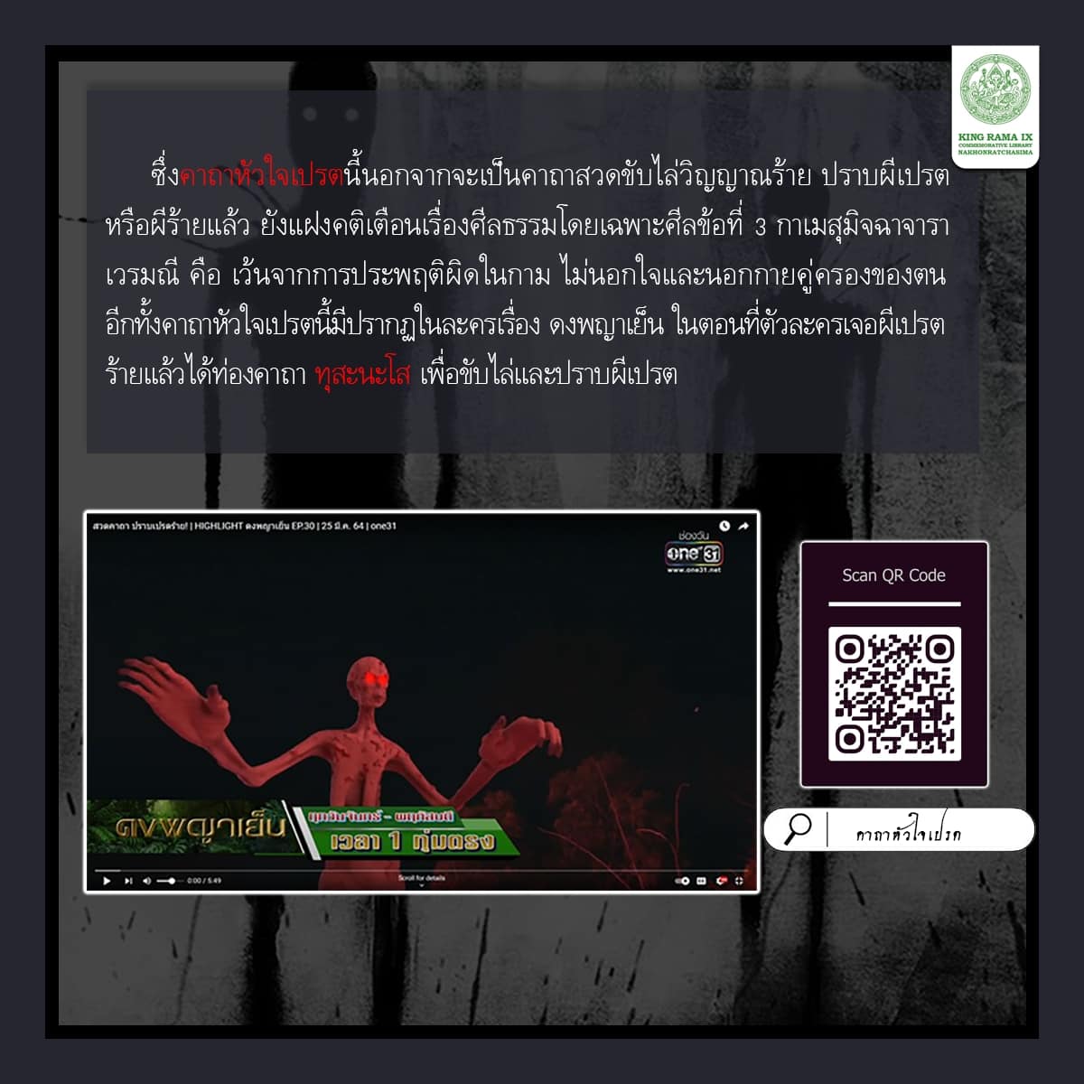 คาถาหัวใจเปรต. [ออนไลน์]. สืบค้นเมื่อ 27 กันยายน 2567, จาก: https://www.youtube.com/watch?v=0Y73MKMaMOA