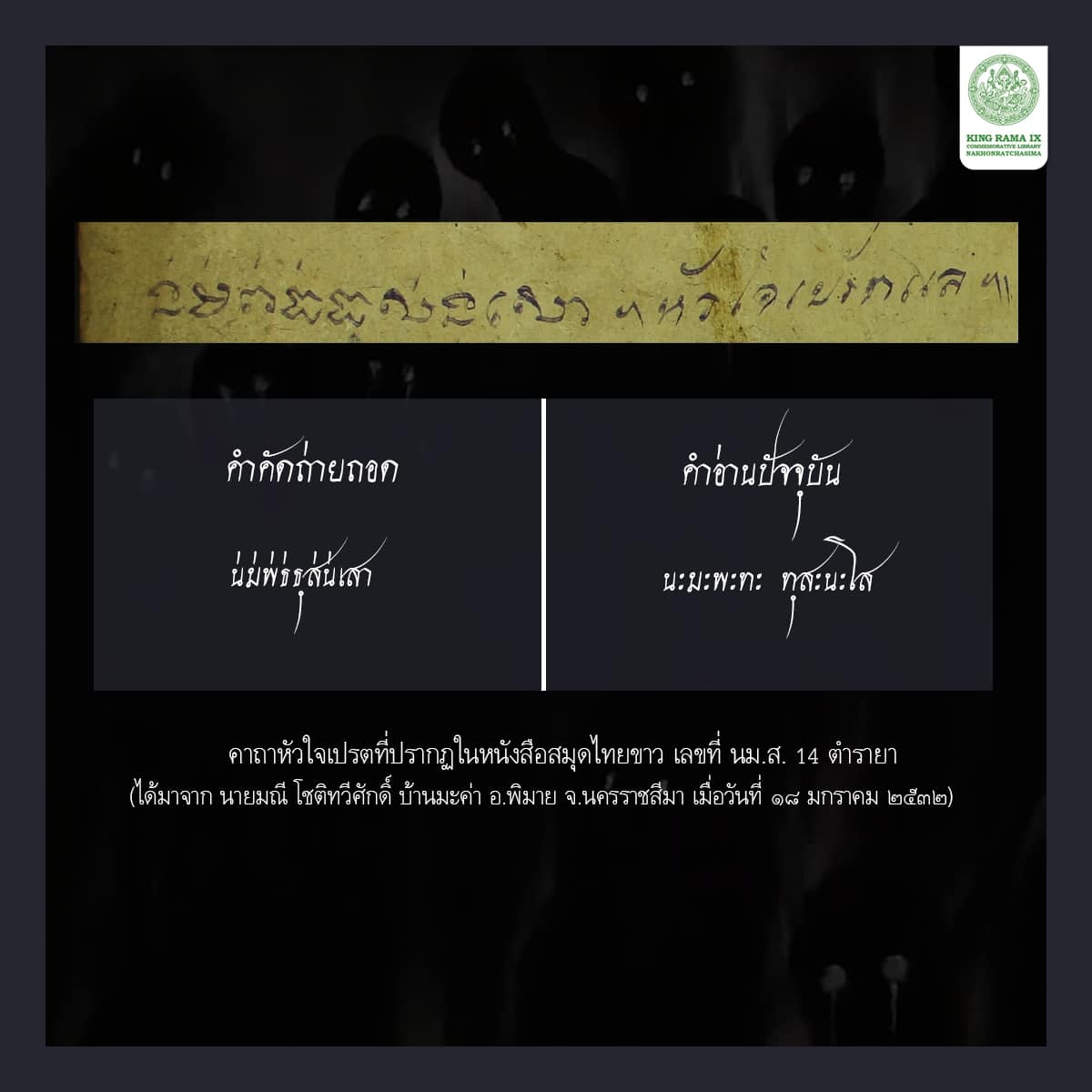 ส่วนท่านใดที่สนใจศึกษาเอกสารโบราณ สามารถเข้ามาศึกษาได้เลยที่ห้องอีสานศึกษา ชั้น 2 หอสมุดแห่งชาติเฉลิมพระเกียรติ ร.๙ นครราชสีมา นะคะ