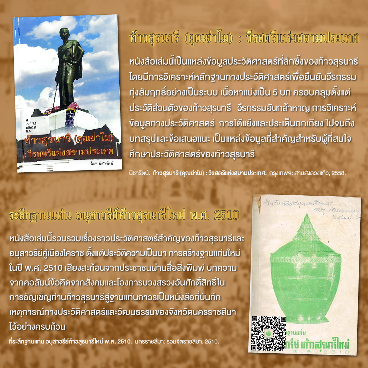 บรรณานุกรม: ที่ระลึกฐานแท่น อนุสาวรีย์ท้าวสุรนารีใหม่ พ.ศ. 2510. นครราชสีมา: รวมจิตราชสีมา, 2510.