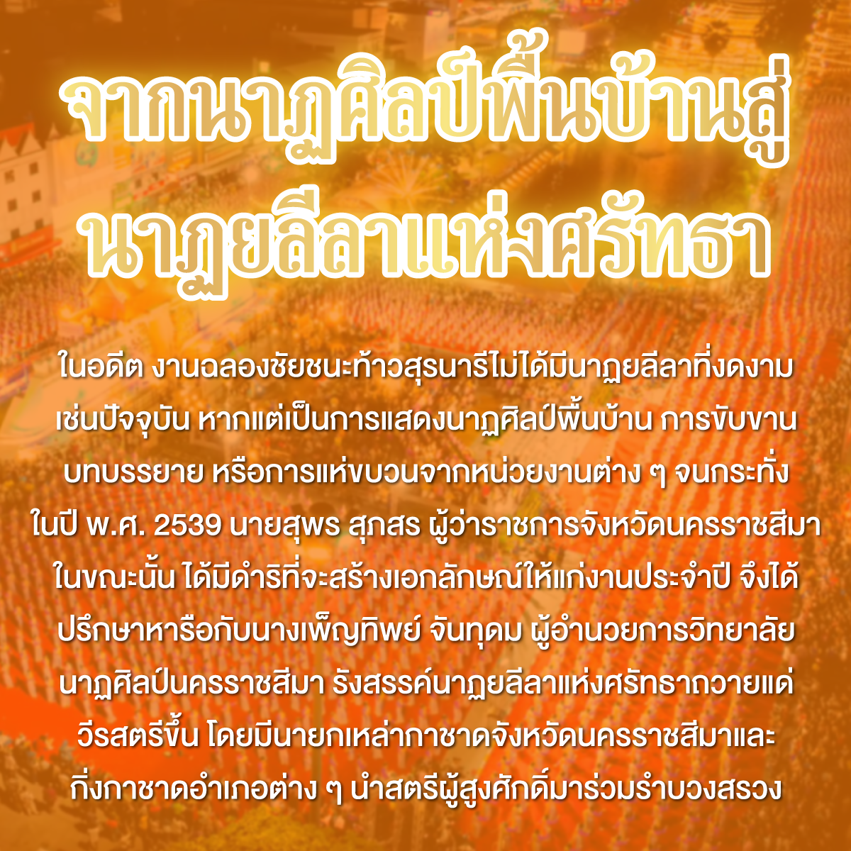 ในอดีต งานฉลองชัยชนะท้าวสุรนารีไม่ได้มีนาฏยลีลาที่งดงามเช่นปัจจุบัน หากแต่เป็นการแสดงนาฏศิลป์พื้นบ้าน การขับขานบทบรรยาย หรือการแห่ขบวนจากหน่วยงานต่าง ๆ จนกระทั่งในปี พ.ศ. 2539 นายสุพร สุภสร ผู้ว่าราชการจังหวัดนครราชสีมาในขณะนั้น ได้มีดำริที่จะสร้างเอกลักษณ์ให้แก่งานประจำปี จึงได้ปรึกษาหารือกับนางเพ็ญทิพย์ จันทุดม ผู้อำนวยการวิทยาลัยนาฏศิลป์นครราชสีมา รังสรรค์นาฏยลีลาแห่งศรัทธาถวายแด่วีรสตรีขึ้น โดยมีนายกเหล่ากาชาดจังหวัดนครราชสีมาและกิ่งกาชาดอำเภอต่าง ๆ นำสตรีผู้สูงศักดิ์มาร่วมรำบวงสรวง