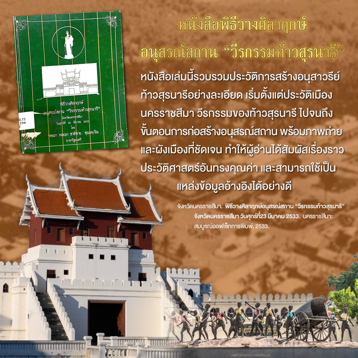 บรรณานุกรม: จังหวัดนครราชสีมา. พิธีวางศิลาฤกษ์อนุสรณ์สถาน “วีรกรรมท้าวสุรนารี” จังหวัดนครราชสีมา วันศุกร์ที่ 23 มีนาคม 2533. นครราชสีมา: สมบูรณ์ออฟเซ็ทการพิมพ์, 2533.