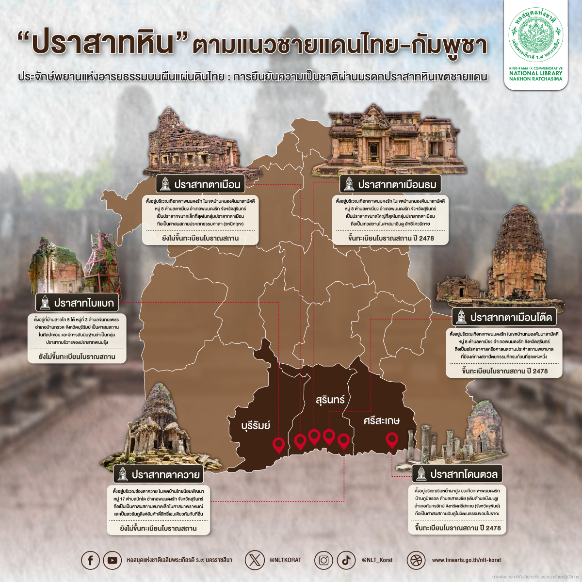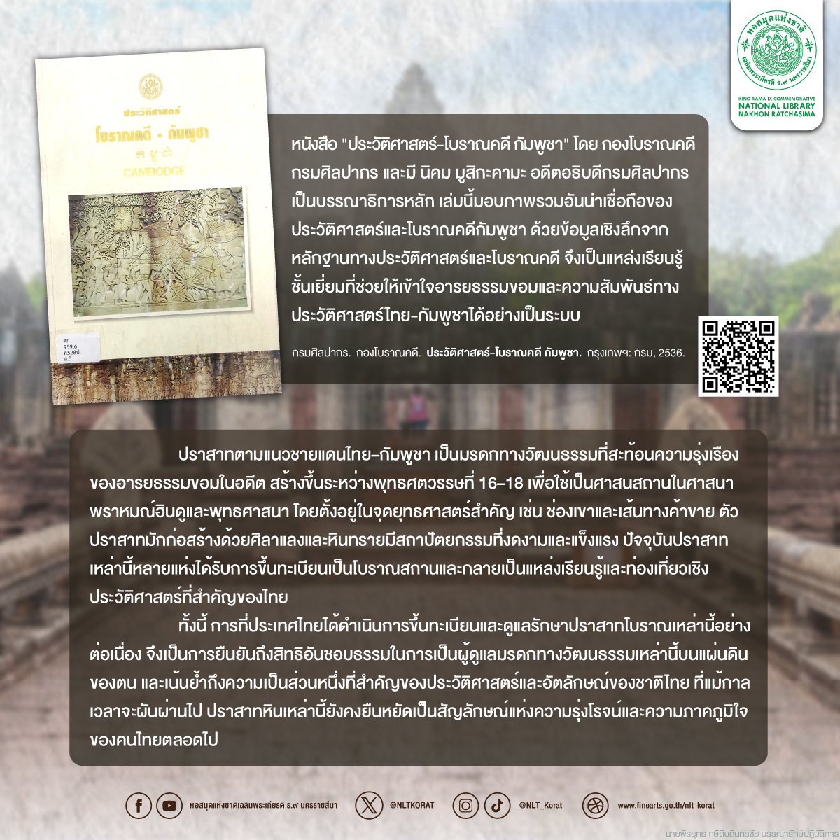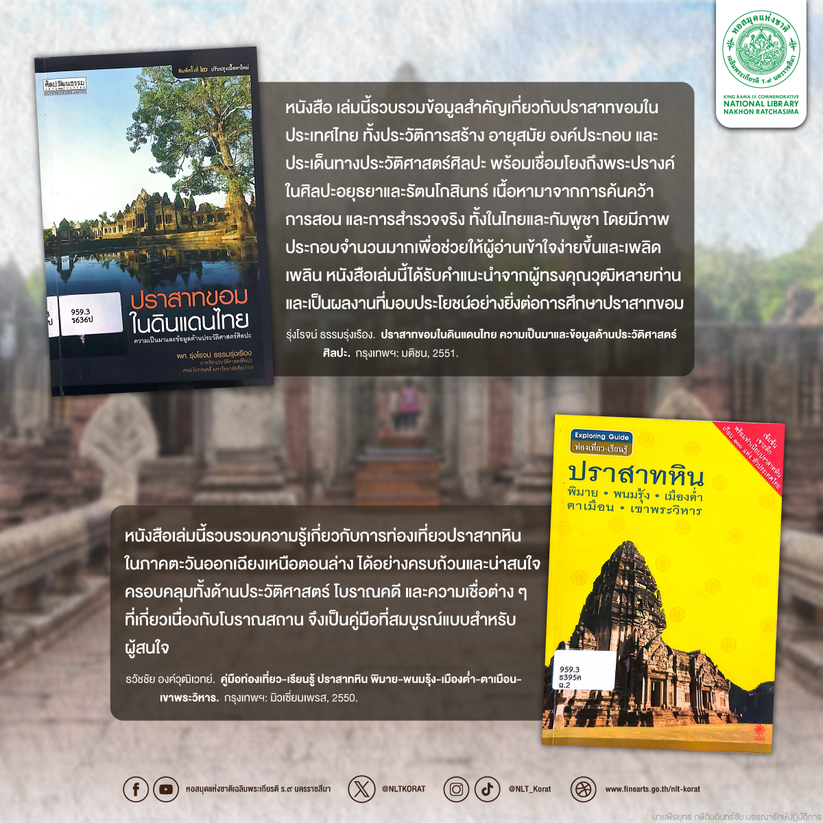 สำหรับท่านที่สนใจเกี่ยวกับ โบราณสถานในเขตชายแดนไทย-กัมพูชา สามารถสืบค้นข้อมูลทางประวัติศาสตร์ โบราณคดี และความรู้รูปแบบทางศิลปะของปราสาทเหล่านี้ได้ที่ #ห้องค้นคว้า ชั้น 2 หอสมุดเฉลิมพระเกียรติ ร.๙ นครราชสีมา เราขอแนะนำหนังสือบางส่วนที่น่าสนใจดังนี้