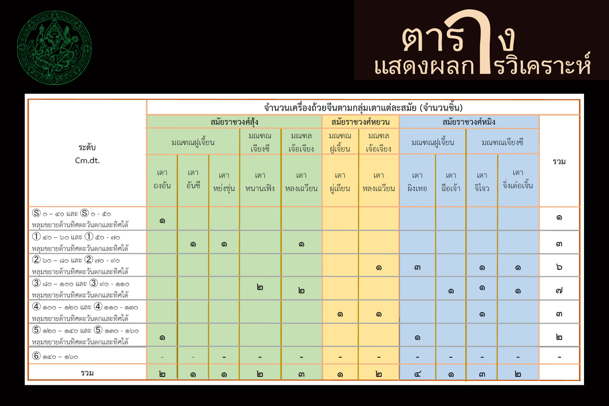 ๑. สมัยราชวงศ์สุ้ง พุทธศตวรรษที่ ๑๗ – ๑๙ ส่วนใหญ่เป็นเศษภาชนะดินเผาเคลือบสีเขียว มีแหล่งผลิตจาก “เตาถงอัน มณฑลฝูเจี้ยน” และ “เตาหลงเฉวียน มณฑลเจ้อเจียง” โดยการส่งออกเครื่องปั้นดินเผาในระยะนี้มักพบบริเวณภาคใต้ ภาคตะวันออกและภาคกลางของประเทศไทย