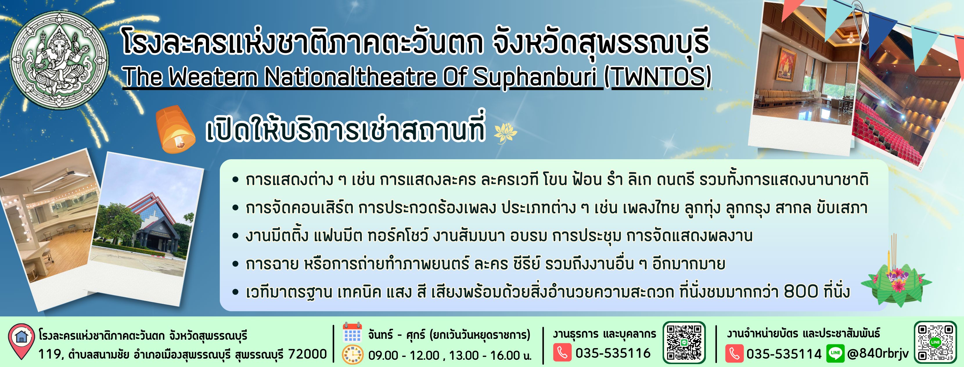 โรงละครแห่งชาติภาคตะวันตก จังหวัดสุพรรณบุรี เปิดให้บริการเช่าสถานที่ ติดต่อสอบถาม ในวันและเวลาทำการ จันทร์ - ศุกร์ (ยกเว้นวันหยุดราชการ) 08.30 - 16.30 น. Line OA ID : @840rbrjv