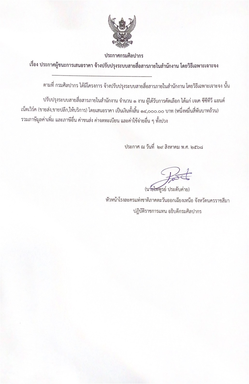 ประกาศผู้ชนะการเสนอราคา จ้างปรับปรุงระบบสายสื่อสารภายในสำนักงาน โดยวิธีเฉพาะเจาะจง