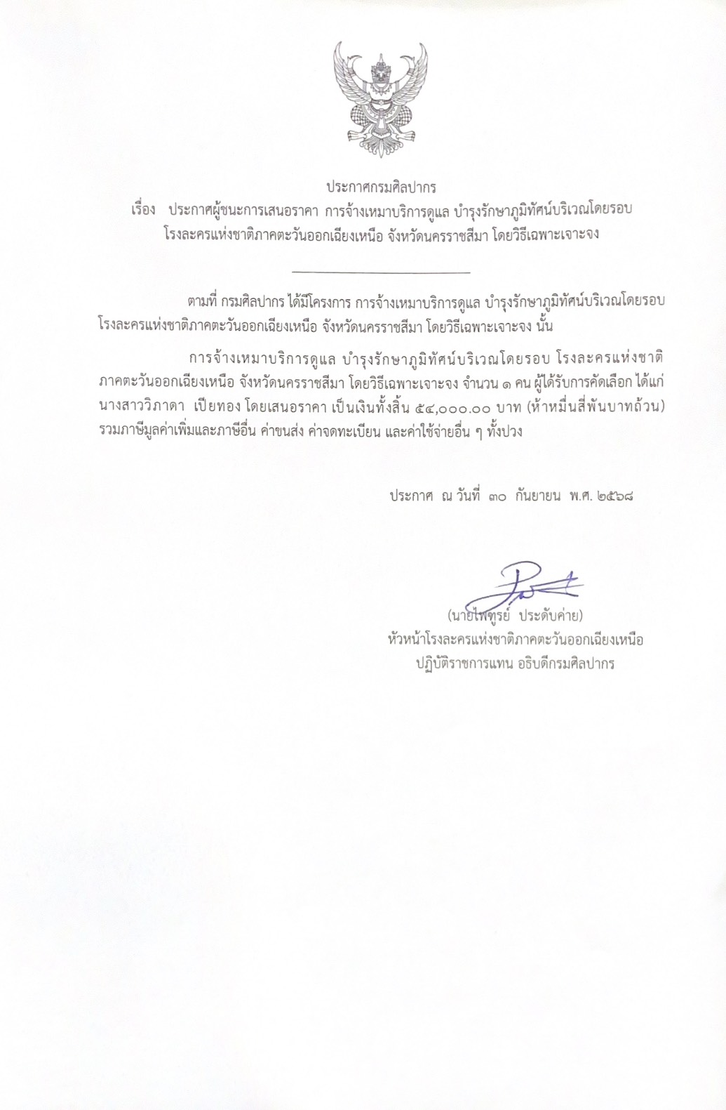 ประกาศผู้ชนะการเสนอราคา จ้างเหมาบริการดูแล บำรุงรักษาภูมิทัศน์บริเวณโดยรอบโรงละครฯ นางสาววิภาดา เปียทอง