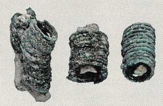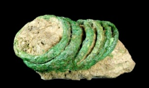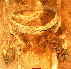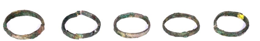 โครงกระดูกเพศชาย สวมแหวนสำริด ที่นิ้วชี้ นิ้วนางข้างซ้าย และนิ้วชี้ข้างขวา นิ้วละ ๕ วง และแม่พิมพ์แหวน แหล่งโบราณคดีบ้านปราสาท อำเภอโนนสูง จังหวัดนครราชสีมา อายุ ๒,๕๐๐ -๑,๕๐๐ ปีมาแล้ว