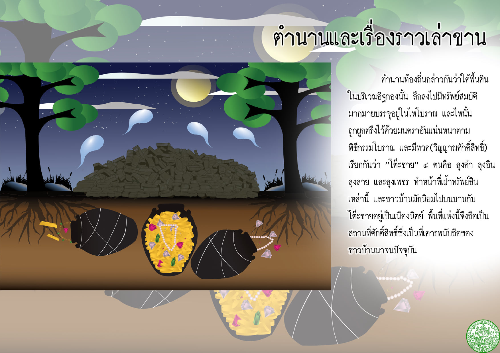 ตำนานท้องถิ่นกล่าวกันว่าใต้พื้นดินในบริเวณอิฐกองนั้น ลึกลงไปมีทรัพย์สมบัติมากมายบรรจุอยู่ในไหโบราณ และไหนั้นถูกผูกตรึงไว้ด้วยมนตราอันแน่นหนาตามพิธีกรรมโบราณ และมีทวด(วิญญาณศักดิ์สิทธิ์)เรียกกันว่า “โต๊ะชาย” ๔ ตนคือ ลุงดำ ลุงอิน ลุงลาย และลุงเพชร ทำหน้าที่เฝ้าทรัพย์สินเหล่านี้ และชาวบ้านมักนิยมไปบนบานกับโต๊ะชายอยู่เป็นเนืองนิตย์ พื้นที่แห่งนี้จึงถือเป็นสถานที่ศักดิ์สิทธิ์ซึ่งเป็นที่เคารพนับถือของชาวบ้านมาจนปัจจุบัน