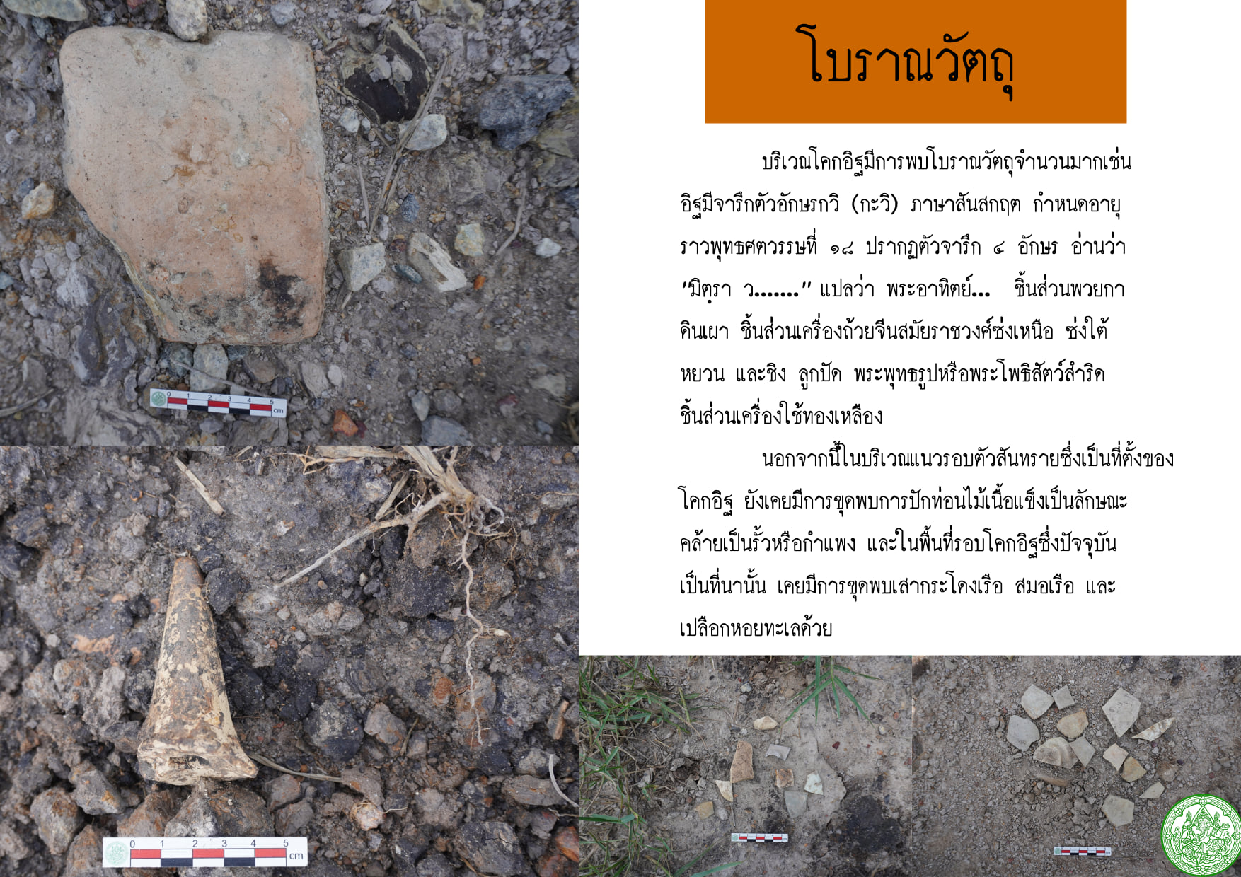 บริเวณโคกอิฐมีการพบโบราณวัตถุจำนวนมากเช่น อิฐมีจารึกตัวอักษรกวิ (กะวิ) ภาษาสันสกฤต กำหนดอายุราวพุทธศตวรรษที่ ๑๘ ปรากฏตัวจารึก ๔ อักษร อ่านว่า “มิตฺรา ว.......” แปลว่า พระอาทิตย์...” ชิ้นส่วนพวยกาดินเผา ชิ้นส่วนเครื่องถ้วยจีนสมัยราชวงศ์ซ่งเหนือ ซ่งใต้ หยวน และชิง ลูกปัด พระพุทธรูปหรือพระโพธิสัตว์สำริด ชิ้นส่วนเครื่องใช้ทองเหลือง