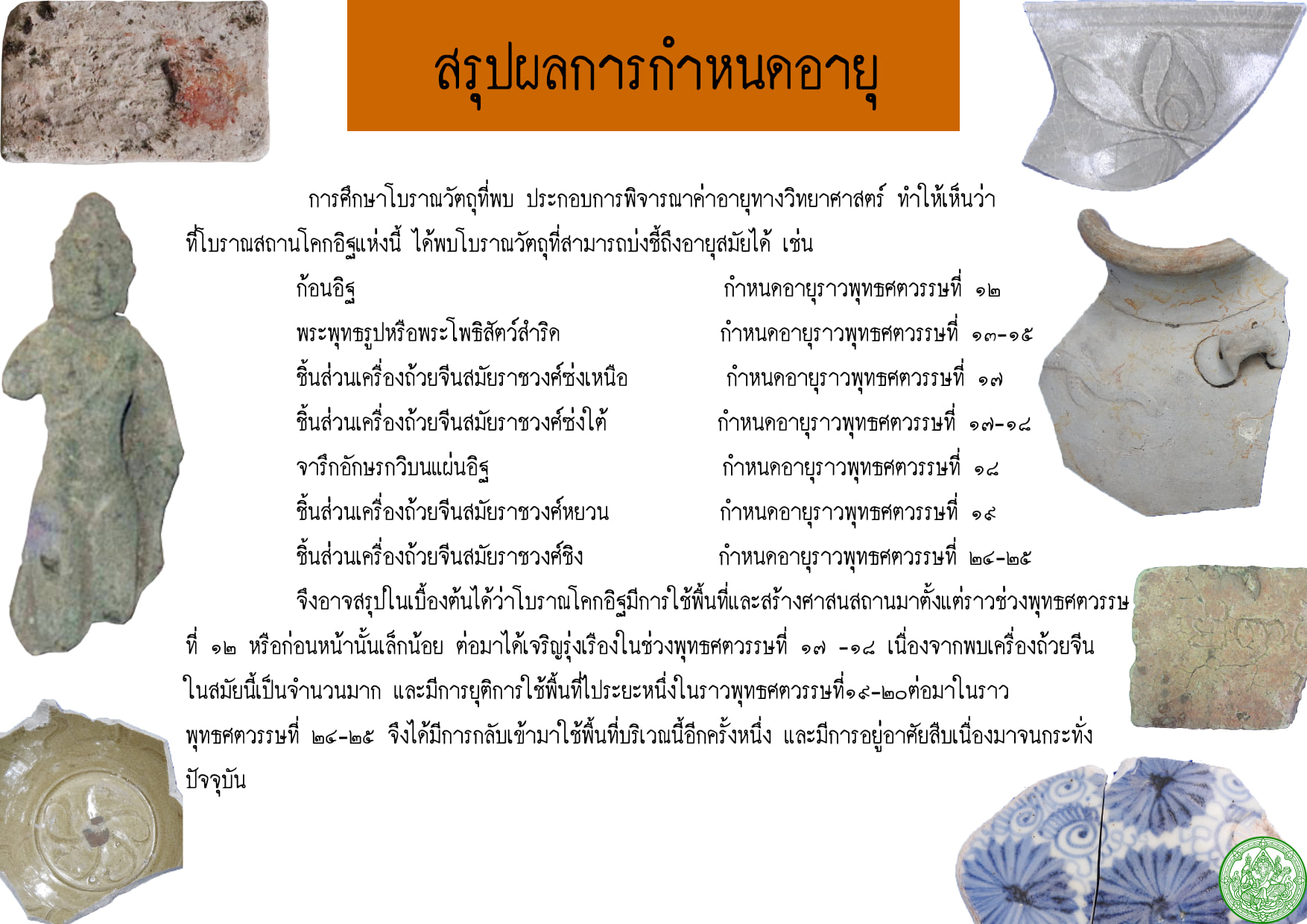 การศึกษาโบราณวัตถุที่พบประกอบการพิจารณาค่าอายุทางวิทยาศาสตร์ ทำให้เห็นว่าที่โคกอิฐแห่งนี้ มีการพบอิฐที่กำหนดอายุได้ในราวพุทธศตวรรษที่ ๑๒ พระพุทธรูปหรือพระโพธิสัตว์สำริดกำหนดอายุราวพุทธศตวรรษที่ ๑๓-๑๕ ชิ้นส่วนเครื่องถ้วยจีนสมัยราชวงศ์ซ่งเหนือกำหนดอายุราวพุทธศตวรรษที่ ๑๗ ชิ้นส่วนเครื่องถ้วยจีนสมัยราชวงศ์ซ่งใต้ กำหนดอายุราวพุทธศตวรรษที่ ๑๗-๑๘ ชิ้นส่วนเครื่องถ้วยจีนสมัยราชวงศ์หยวน กำหนดอายุราวพุทธศตวรรษที่ ๑๙ จารึกอักษรกวิกำหนดอายุราวพุทธศตวรรษที่ ๑๘ และยังพบชิ้นส่วนเครื่องถ้วยจีนสมัยราชวงศ์ชิง ซึ่งมีอายุราวพุทธศตวรรษที่ ๒๔-๒๕