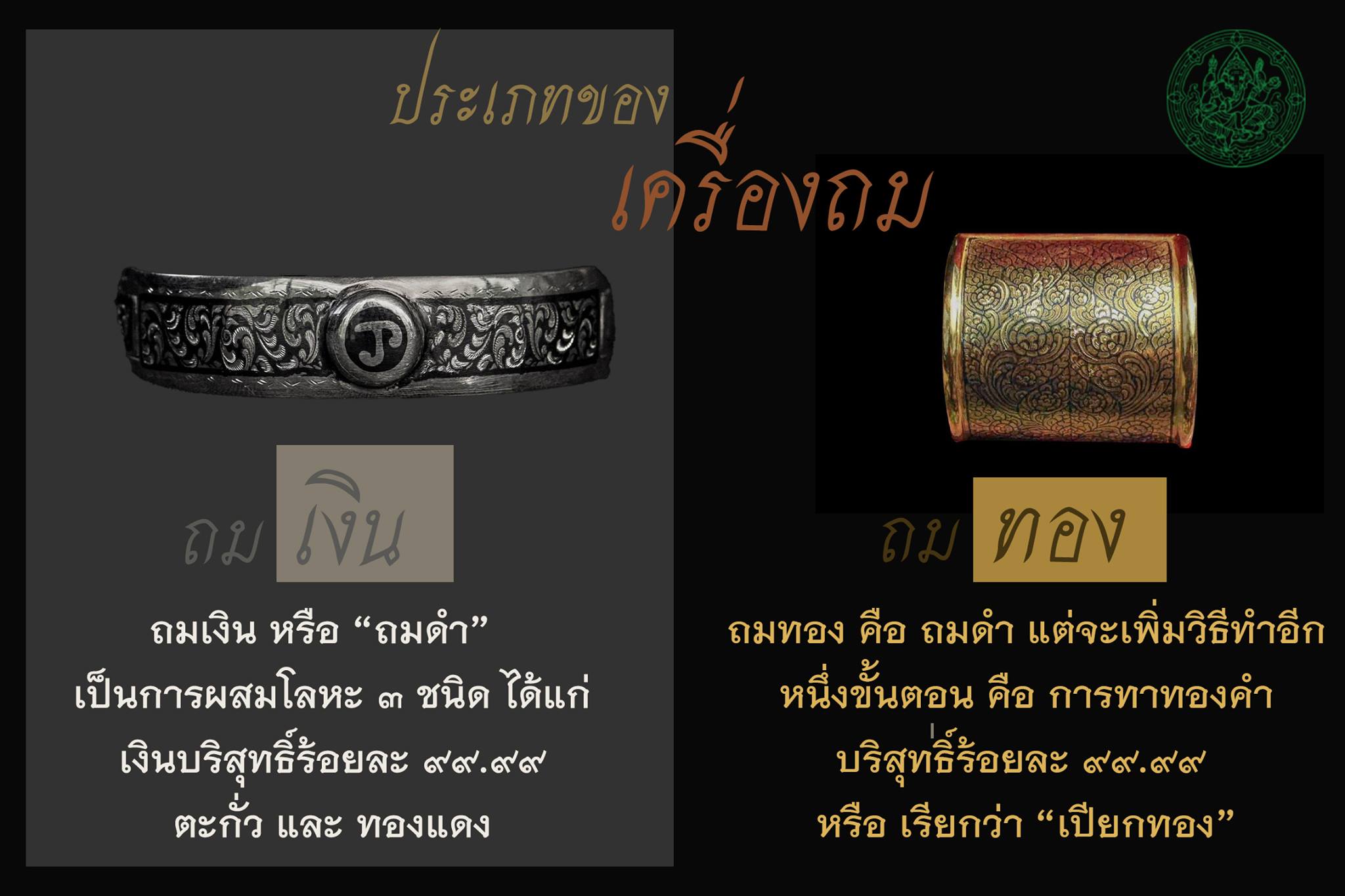 ๑.๑) การทำน้ำยาถม เป็นหัวใจสำคัญในการทำเครื่องถม ลักษณะเด่นเป็นเอกลักษณ์ของยาถมของช่างนคร คือ มีลักษณะแข็ง สีดำเป็นนิล ขึ้นเงา ประกอบด้วยโลหะ ๓ ชนิด คือ ตะกั่ว ทองแดง และเงิน ตำราถมโบราณท่านมีไว้ว่า “วัว ๕ ม้า ๖ บริสุทธิ์ ๔ ผสมกันแล้วขัดด้วยกำมะถัน ได้ยาถมแล”